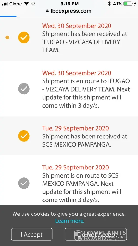 I ordered 2 samsung cellphone units from a samsung store in manila and already paid via credit card. According to the company it was already shipped sept 28, 2020. It was received by nueva vizcaya ifugao lbc september 30, 2020. Until now I haven't received my package yet. Not even informing of the tracking tracking number. I haven't received any calls. I haven't complained earlier because i'm giving them consideration due to the pandemic.. But it's more than 2 weeks already. This is the second time lbc did this to me..