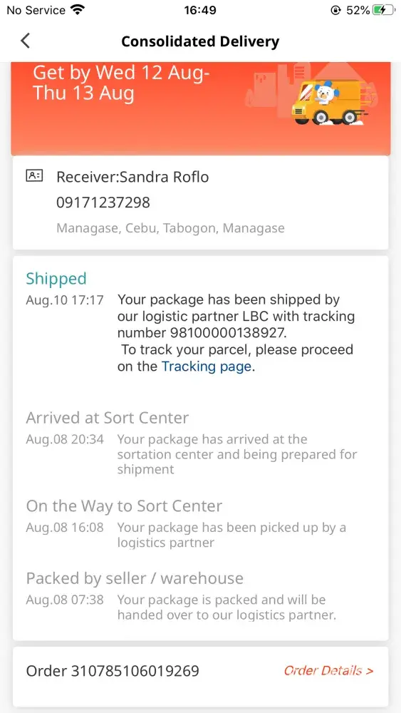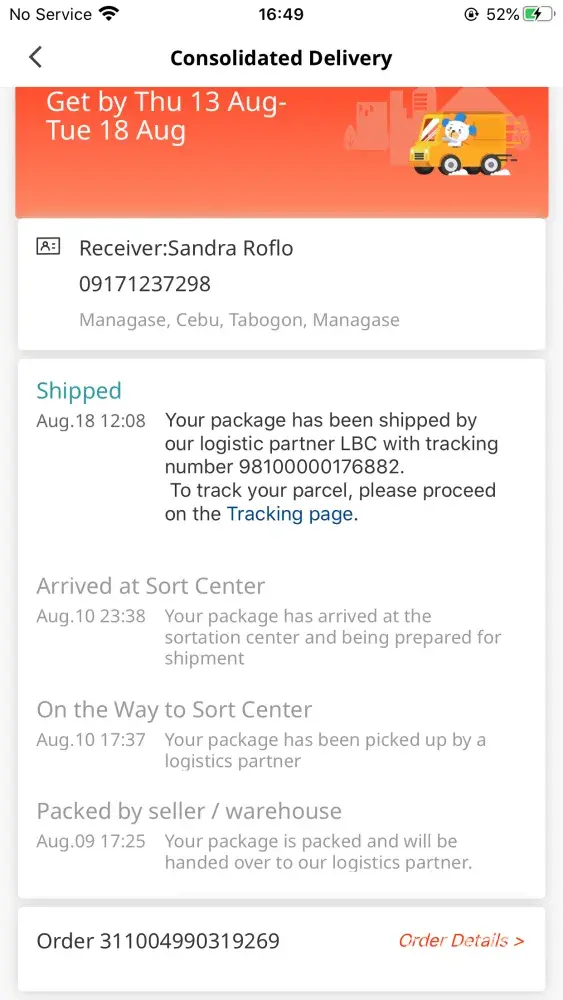 Hi! It's been beyond estimated delivery time of my packages ordered from Lazada but I still haven't receive them nor heard anything from LBC. I already e-mailed LBC and Lazada several times but Im still waiting their reply. I understand it's been hard for everyone during this time but when I ordered where NinjaVan is the courier, it only took them a week to deliver my orders. I'm really looking forward for the delivery since I'm badly needing the table for my WFH set-up. Please see attached files for reference.