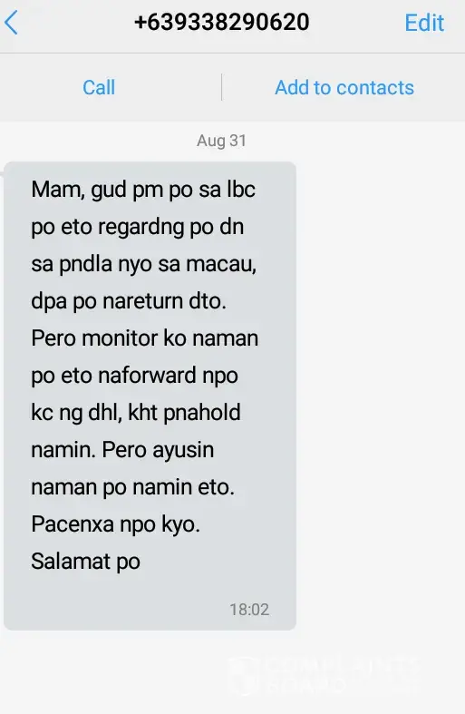 I would like to make a complaint about my transaction in the lbc-robinson lipa branch. August 27 I went to lbc and inform the teller that I want to send 2 employee id to macau and he asked me which country because he cannot find macau in his system so I told him that macau is part of china and I have written the complete address which indicates macau, china. I've patiently waited for him for about 20 minutes because he said his a newbie and not familiar with the international transactions. He kept asking his colleague beside him and his manager whos on a meal break. He also has an issue with my recipient because he mentioned that elaine chan has the same name in their system with a record. All those things were fine for me but in the end, he told me that he can only encode portugal so he can input macau in the address and I told him I don't have any idea about your system just make sure it will be sent to macau china ok? He says sure, and his colleague beside him knows the venetian macau that's why even I saw in receipt portugal I did not worry because i've written the full correct address. So when I got home my husband asked me why I paid 2390 pesos for the shipping fee, I told him it's international that's why it is expensive but he is not convinced so he checks in lbc website if the amount is correct and it turns out that I should pay 840 pesos only. And my husband found out that the 2390 pesos fee is for portugal in europe not in macau. So the next day I went back to lbc-robinson lipa and told his manager what happened, his manager apologized which is good and she mentioned she has already emailed the issue and I just need to wait till monday (august 31) for the parcel to be returned and void the transaction so they can give me back the excess payment. And guess what happened on august 31? The manager just sends me a message saying my parcel is not yet returned because it has been forward to dhl even they already request to hold and return my parcel. It is september 3 today and I have not received any update about my issue, I will go back to lbc-robinson lipa again to check what happens. Please do something with my complaint, they give me so much trouble and delay already. Tracking no [protected]