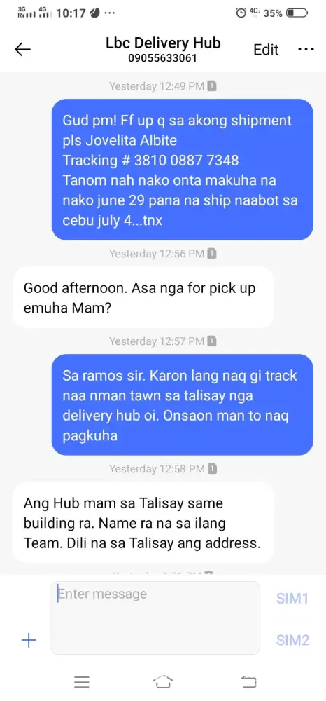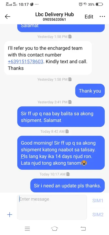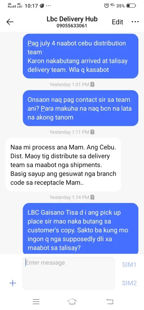 Last June 24 my parcel has been shipped from Benguet. Last July 4 my parcel finally artived in Cebu Distribution team. I called Cebu Distribution team asking if I can pick it up since it's perishable but they said I can only pick it in the distribution branch because it's COP. I waited until Monday and kept on tracking but no update even follow up with the LBC warehouse. They gave me the contact number of the distribution hub. I was told to wait. It was Tuesday when I tracked again and found out that the item was already in Talisay delivery team when I'm only in Tisa, Cebu City. They told me they will update me soon but until now they never bothered to contact me. I've been reaching different contact numbers from Customer Service to Cebu Warehouse, Distribution hub to Talisay Delivery Team but non of them is reachable. Please help inside my box are plants. I don't think they still are okay after 14 days. Today is the 14th day.