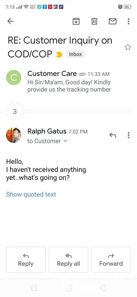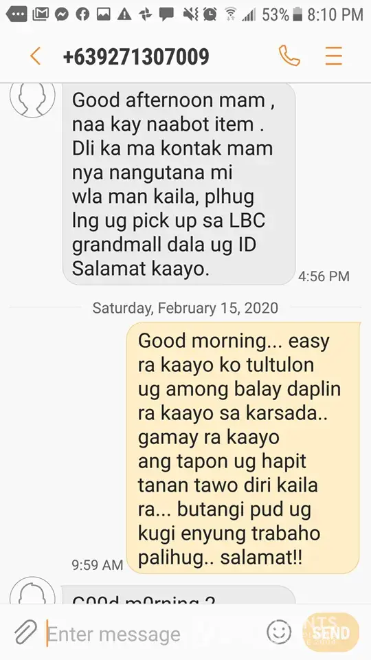 His reasons were: he was not able to contact me and I did not replied to his message (please refer to the screenshot of the exchange of text messages) and that "nobody" knows me. So I replied that it is really so easy for him to locate me since I am living along the national road and in our village everyone almost know everyone specially I grow and live here for 35 years already. To give u further insight, being a sibbling of the owner of one of the bigger stores in our village for 26 years and running passenger jeepneys, 9 years ago and being a small intrepreneur myself in our community and with neighbors that are almost all are related/relatives since my great great, great grandparents, grandparents and parent are all native/local here. So commonly neighborhood knows almost everyone. I made a remark or suggestion, just to please be diligent "butangi pud ug kugi enyung trabaho palihug", to put at least a little extra effort in doing his job, coz in customer service we go/do extra mile for our customers. For me if only he had the initiative asking on the right places like brgy hall, convent, or right people, not just one or 2 maybe, he would be able to find me. But he replied that I have no right to say that and that I am just very "judgmental" and he insulted me that if almost everyone knows me and" Im being popular" (which I never said I am popular), why is it when he asked, they dunno me or nobody knows me. I dunno where did he asked and how many did he asked. So if every courier and delivery personnel are this rude and disrespectful and proud in responding their customer's concerns and maybe not doing their duties appropriately. Where's is the costumer service and customer value here? If they will only depend on the contact numbers what if the customer's/client's phone was lost or stolen, or just had a poor to no signal at all? Are they/is he going to blame the customer coz we can't be contacted or can't reply? What's the purpose of the address that you asked from us to fill in? It defeated the purpose of putting our postal address then. Suggesting and commenting to be diligent "butangi pud ug kugi ang enyung trabaho palihug" in doing his job is not being judgmental to the person as he accused me of saying so. Obviously it's not about him, it's about on how he handle his job and take initiative on the circumstances. It is his responsibility. If other delivery personnel can do it finding me, why can't he? If all LBC personnel will just insult, being rude, and will just fight against on a customers' comments about their bad services, badmouth and bad behavior and even challenging and provoking me to file a complain coz he is not scared to face me.
