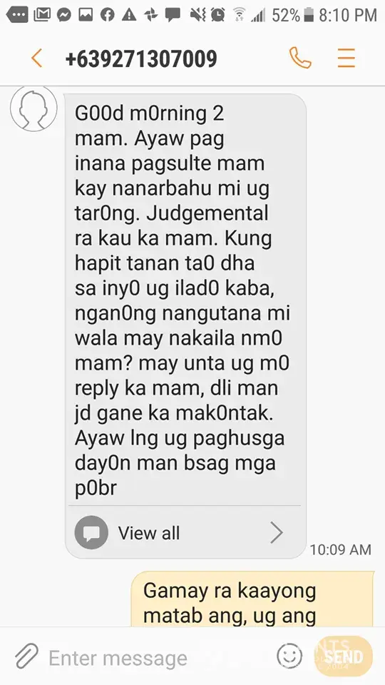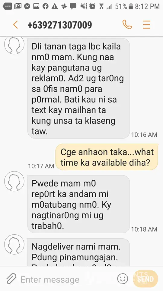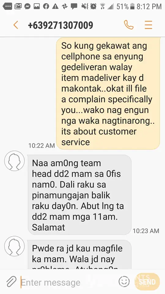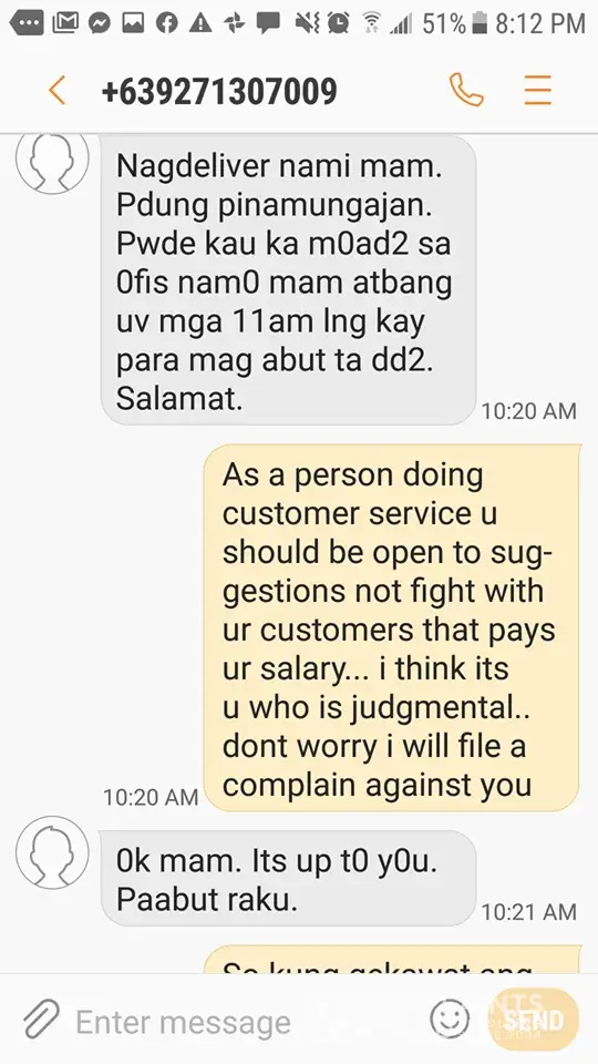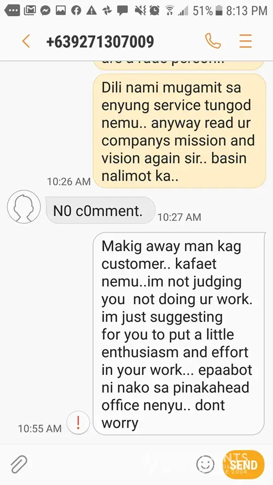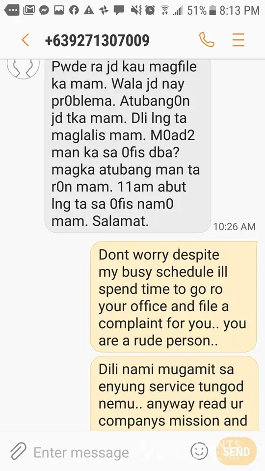 If u refer to the exchange of text messages after I said that I will just report him to the office because of his mean and rude response in regard of his failure to deliver the service/package. That's the time he sarcastically replied that we should stop arguing over text messaging because it will only describe us " who we are us a person". In the first place he was the one telling me I am judgmental. In that sense, who is judgmental now? and he has no right to say that in relation to the responsibility of his job and line of business. Instead of pacifying customer to win them back after the inconvenience, he kepts provoking me to go file a complain like he said, "Pwede mam mureport ka andam "mi" muatubang nm0 and coz he is not afraid of me and he is/"they are" (maybe he mean his team) is/are willing to face me. Why is he using "mi"? Does that mean all his team is willing to face me and cover his misbehaviour? OR is he scaring me?