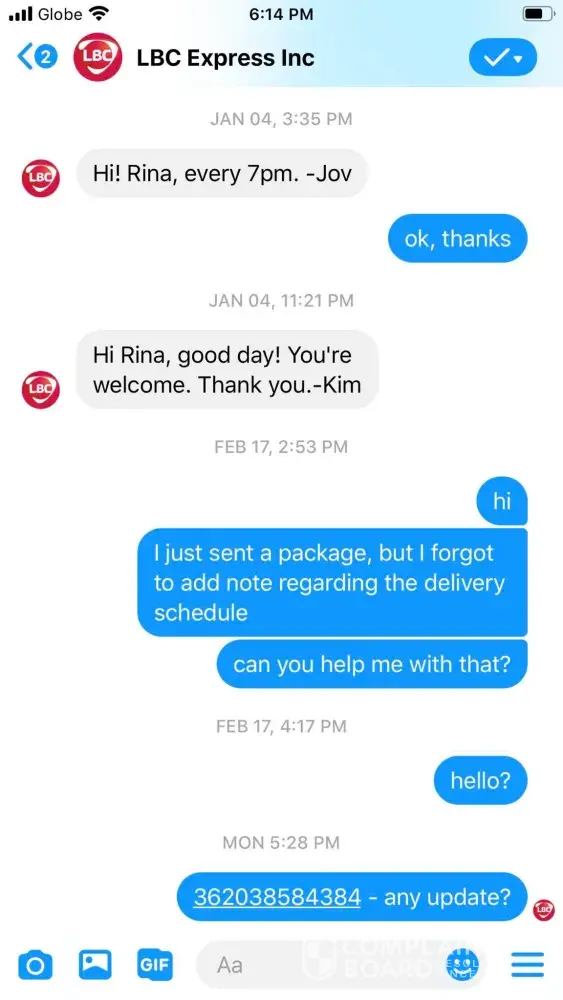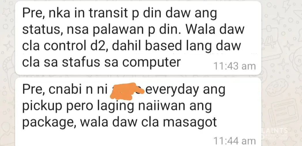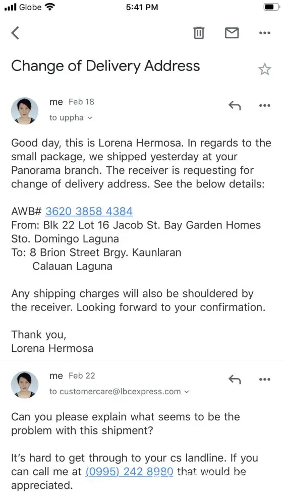 I send my shipment to Panorama Marikina branch last Feb. 17 and gave me the waybill [protected]. The following day around noon someone from LBC Customer service called me that as they are about to deliver the item, the receiver decided to change the address to her work address. So they asked me to write an email regarding the change of address to uppha..( the Upper Laguna LBC Branch) and go to Panorama branch to also advise them regarding the change of address which I did that day. The ff day, Feb. 19, upon checking online, there is a note that says there is an issue so I have to call. They didn't have the address pa raw so I gave them the details. The next day, same note so I called again and gave the info again and they said I have to wait for 2 days for the process. Feb. 22, the online said ready for shipping but also theres still the concern again. So I called again and said 2 days process. On Feb 24 same issue. There's this problem with the Upper Laguna branch so the customer service agent told me he'll escalate the concern so I gave the details AGAIN. Today, Feb. 26, I called regarding the same issue and said they bring the item to Pasay because of the pending issue on address. I request for a return call from the manager and said will call after lunch. Its 5pm and no call. So all my calls and time are all wasted because the said issue was not addressed.