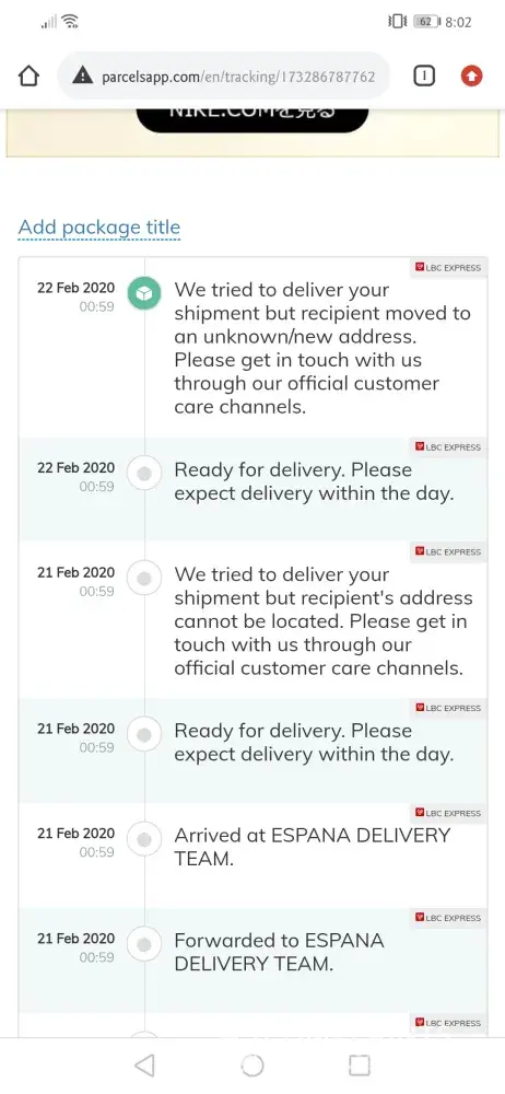 Complaining about non delivery of item i bought online. Lbc Tracking no. [protected]. It's my 3rd transaction for this seller same address but your delivery said address can't be located and incomplete. Got no problem with other deliveries incl grab food same address. What's wrong with your delivery men? Very inefficient don't even bother to call or txt if he can't locate the place. It was sent to me last feb 13 but until now I have not receive the package yet. I callled lbc hotline twice and said it's on the way. On the way where?