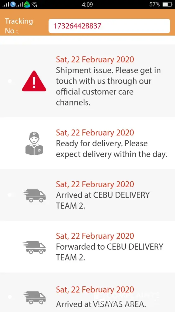 I don't know what happened, last February 21 I ordered something, tapos on transit na, by using the tracking number po ang sabi naka rating na sa Cebu nung Feb 22, 2020 yung parcel ko and it says ready for delivery . Expect delivery within the day, nag antay po ako buong araw pero walang dumating and later on tsinecheck ko yung status ulit tapos ang nakalagy shipment issue daw? Pano nangyari yun e ready for delivery na nga...still waiting for my parcel to be deliver, hope maayos to..