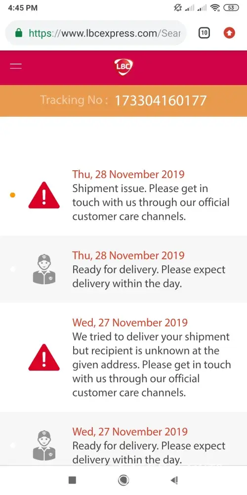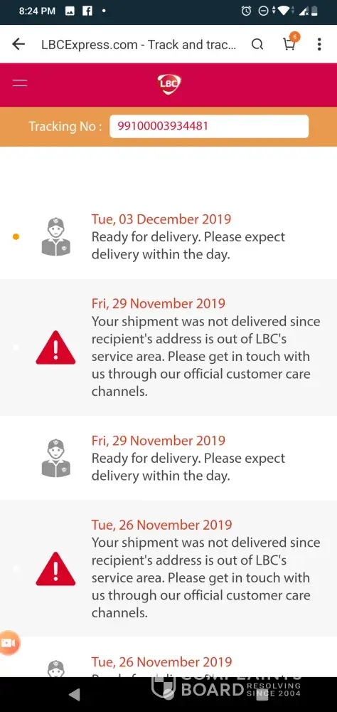 I am complaining about the item that lbc san pablo laguna failed to dispatch! i already have 3 tracking numbers due to failed to deliver for multiples times. Pano ba magdeliver mga delivery man nyo? once is enough but failed to deliver for 3 times in a row? aba may problema yang delivery man nyo...If i can only choose the courier kaso ung banko ung pumipili ng courier! Sobrang detailed na ng address bakit di nyo mahanap hanap un address eh along the highway lang naman ung address!