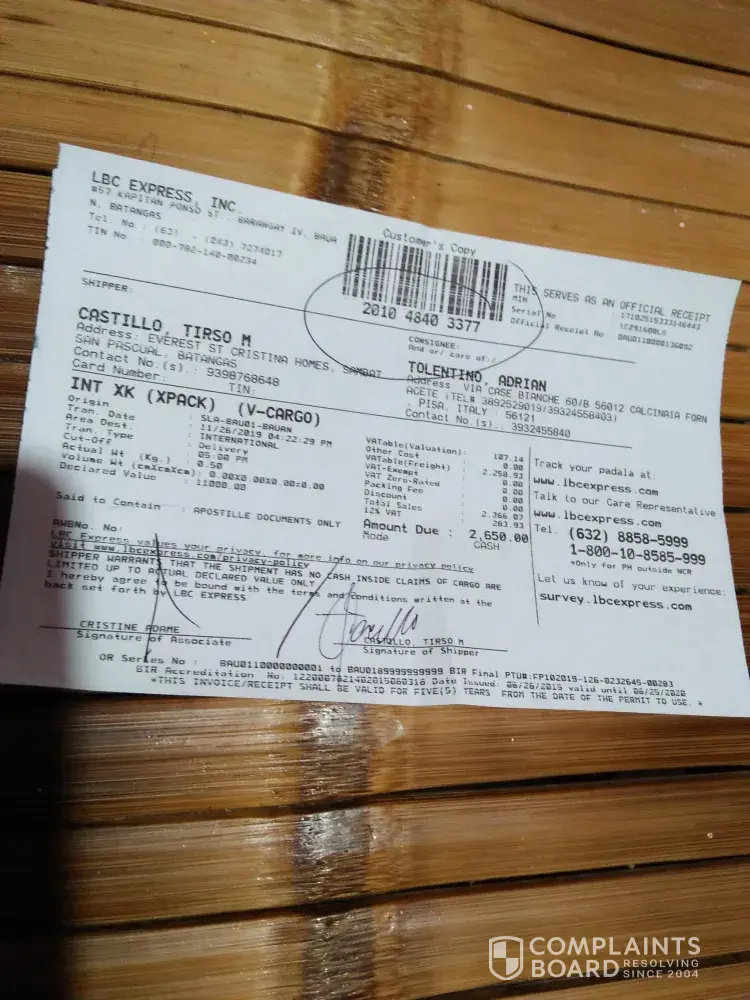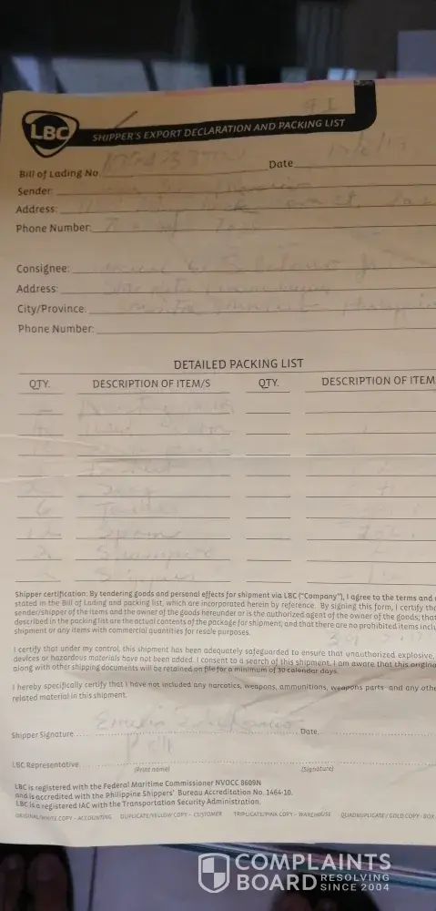 I would like to file a written formal complaint regarding a Balikbayan box from my aunt, Emilia S. Del Rosario in Las Vegas, which is sent to my dad, Pascual L. Sabalvaro, Jr. here in the province of Oriental Mindoro. We had received the box last November 27th. Attached here is the copy of the receipt that we got with Bill Lading Tracking Number [protected] and list of items that should be inside the box. We had noticed that some of the listed items were actually missing, such as the 40 pieces of clothes, 6 towels and a pair of slippers. Attached here are the images of what some of your staffs in LBC had done to the box. They had cut the side part of it, had entirely opened it, which is unacceptable since some of the listed items on the receipt were missing.