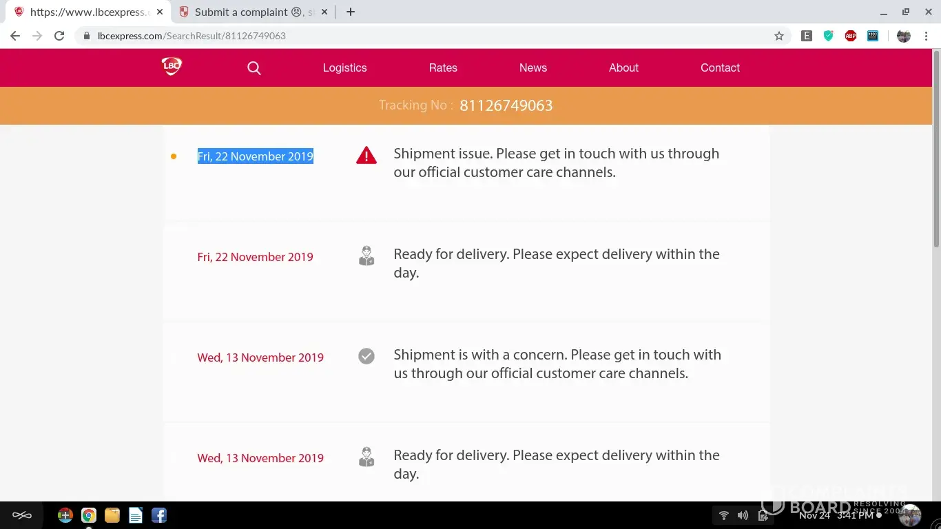 On Novemeber 11, 2019 I received a message from LBC saying that my item will be deliver on that day. Upon tracking my item, it has been delivered on 11/11/2019 BUT I never received any calls, and I never received any item on the said date.