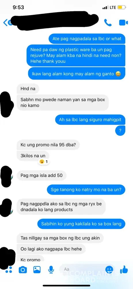 Good morning. Literally not good! I was appointed to deliver a kit today but suddenly your employee get attitude on me. Una sabi nya sakin na need iplastic ware yung papadala ko kasi rejuv set sya then ask ko sya kung san kaya nakakabili non and then sabi "hindi ko alam" (like she is not interested to her costumer) considerable sana kung madami costumer don but ako lang yung nandon. Then okay na nag ask ako sa supplier ko ng product ko ganon ba talaga sa lbc? Then she answered me *our convo in the picture*. Then bumalik ako sa lbc to ask na pede naman daw po pala na lagay sa box un kasi nakabox na yung product then yung liquid nya is nakabalot sa plastic kasi sa friend ko po ganon then she laughed like akala nya nakikipagbiruan ako sa kanya then she said na "talaga ba?". Well kung un talaga standard wala akong maggawa pero sana kumuha kayo ng employee nyo na magaling makipag usap sa costumer nya hindi kagaya nyang walang manners. So dissapointed!