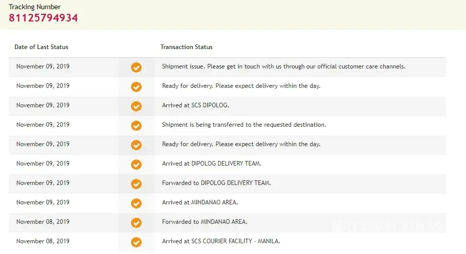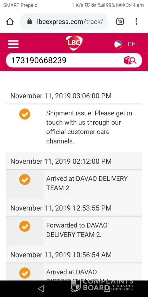 Yesterday as I was expecting for the delivery of the product I ordered since it has already arrived at davao team. Upon checking the tracking number, I found out that there was a shipment issue, and I was told to contact your customer care service.. I am asking your assistance now on how to settle the shipment issue with regards to the product I ordered. It is expected to be delivered yesterday.