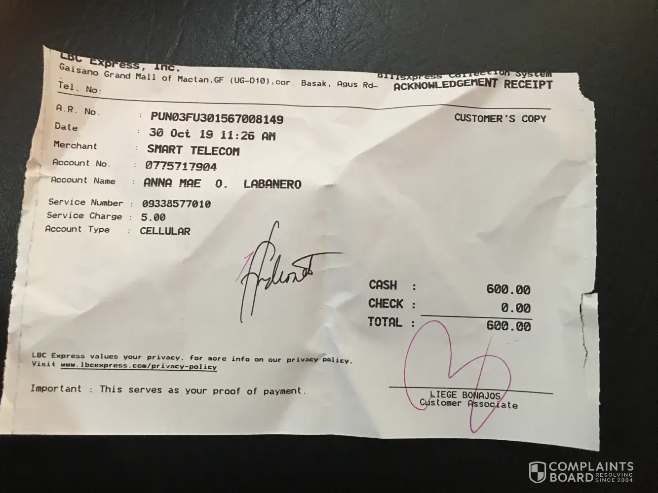 The payment service of LBC express in Gaisano GM, Mactan, Cebu received my payment amounting to 600 pesos but failed to remit to sun cellular company.