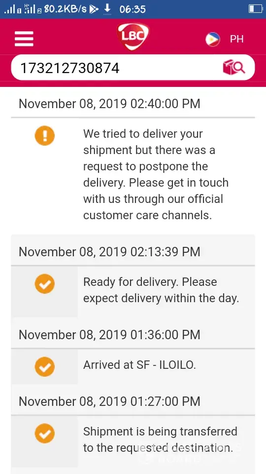 Hi, Good day. Today I went your LBC Headquarter in Cebu to clarify my shipment unfortunately my parcel he send it back to the sender without knowing me or consent. Last week November 8, 2019 I received a text from LBC express that I have parcel to receive unfortunately I'm not in the house I was heading going airport for urgent appointment. So later, this guy from LBC courier texted me asking my location, I told him if can you hold my parcel because I'm not in house, See you on Monday. Yesterday November 11, 2019 LBC express texted me again that I have parcel to receive today this guy i texted him right away that I'm already in Cebu but any one if my messages on him he didn't answer or replied. That's not right because why he send back my parcel to the sender without knowing me. He should communicate me because I have a parcel and thats very important I order it online my vitamins. I trace his name Mr. Tuñacao, mobile# +[protected], reference # [protected]. Thank you!