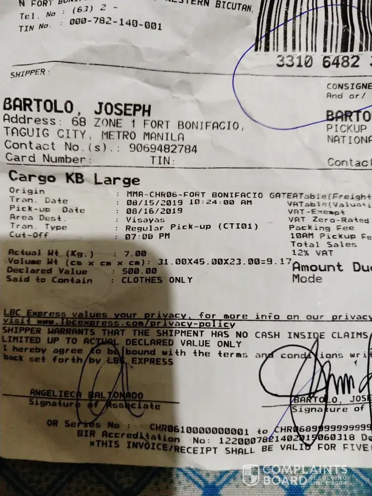 Hi! I am the shipper, hopefully my complaint will be addressed to the management of LBC. I've send the document dated August 15, 2019 until now the consignee haven't receive any.