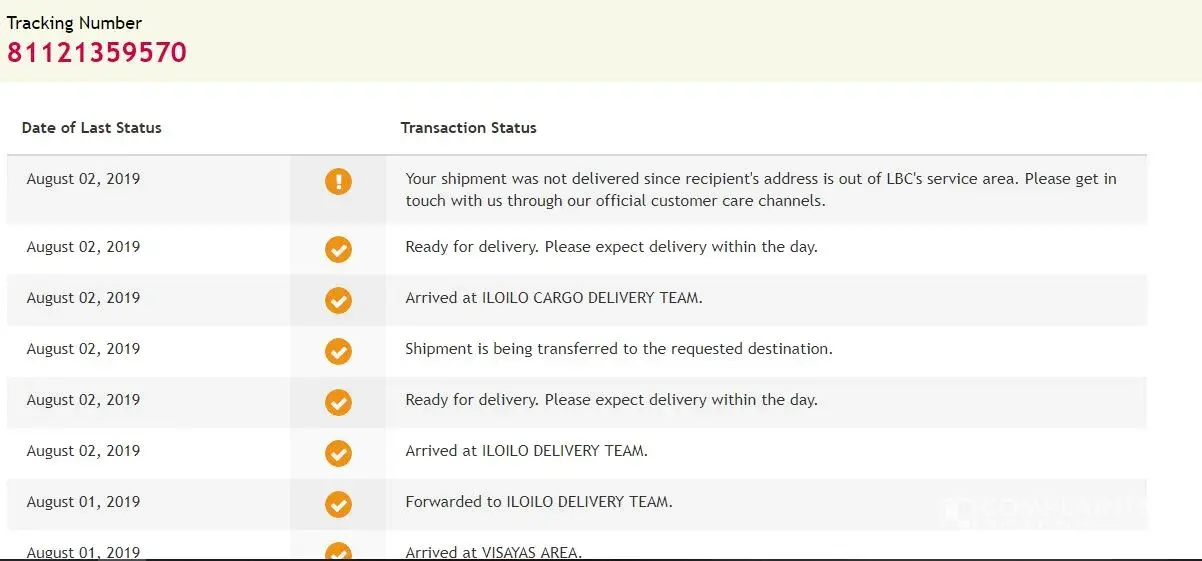 I thought my parcel will be delivered on they day as it was stated on the site. To my dismay, I didn't receive any. It says that the shipment was not delivered since recipient's address is out of LBC's service area but it's just half kilometer away from my house! I also didn't receive any call or message regarding my parcel. If I didn't track and trace it, I wouldn't know. I've been calling the office many times but no one's answering.