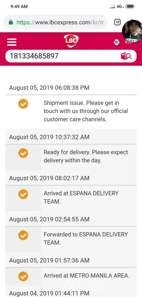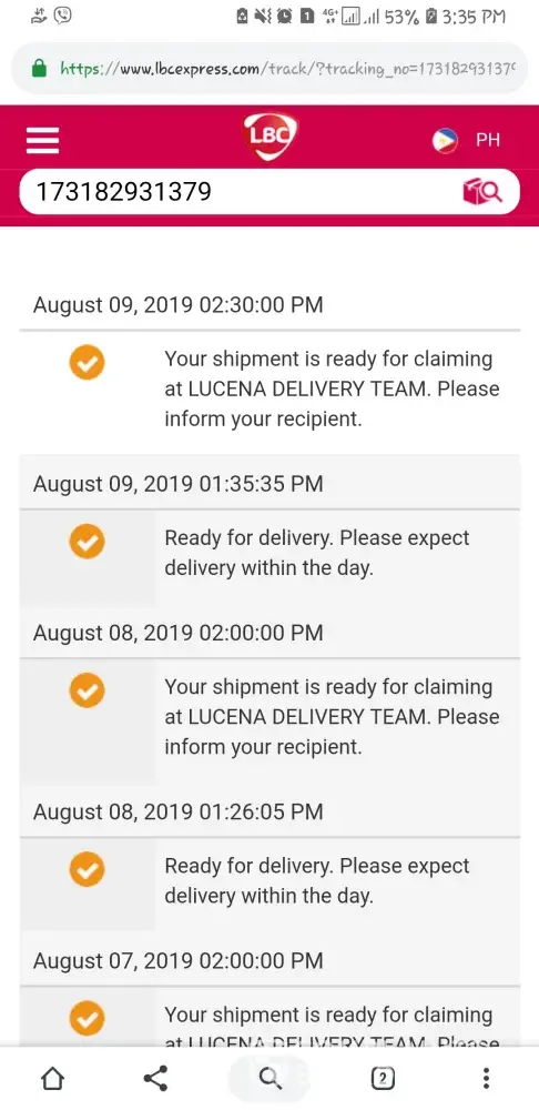 Per information that had appeared from LBC tracking, my packages arrived at delivery team in Legazpi City at 12:42AM August 6, 2019. Unfortunately, these packages have not been forwarded until 5:00 PM same day to LBC Br Rizal St, Old Albay District, Legazpi City where I am supposed to pick them up. For more than 4 hours, LBC delivery Team did not bother to deliver the packages to the pick up point. Why this delay?