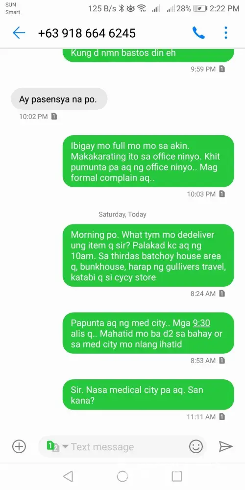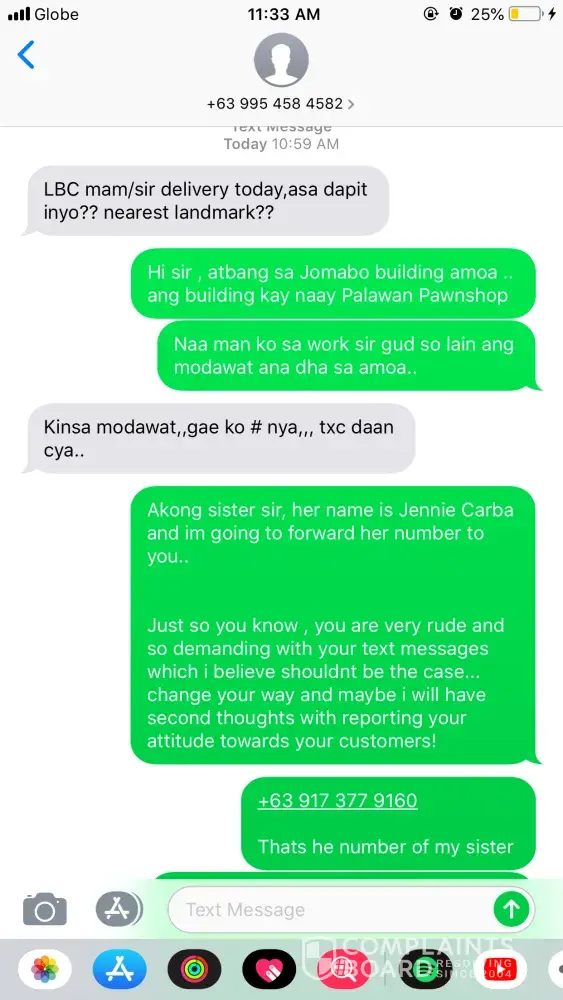 Hi, i would like to raise a complaint for the delivery person who is responsible for the tracking # i forgot. . My friend have sent me this item the other day and she told me it was supposed to arrive yesterday, however i did not receive any delivery yesterday. So she told me that it might be delivered today. Luckily, one of your delivery persons have texted me around 10:59am and was asking for the nearest landmark. Immediately i responded as quickly as possible and informed him that i am currently at the office and somebody else will receive the item for me. To my surprise, the person replied to me not just in a demanding way but as well as in a very rude way. Again i responded to him and gave him a side comment that he is way very rude and that he should be mindful with it. Since, around 11:10 am, he never replied to my messages and i texted him again for a couple of times regarding the time of the delivery so i could give my sister a heads up about it. He never replied and i tried calling the number but he was out of reach. Around 2:14pm this afternoon, my sister told me that the item has already been delivered. Good thing that she managed to get his name. JOSELITO BIHO ... please make sure to create a complaint for this person because i am totally upset right now about how he treated me.. sad this you got a person like him in the company who represented the whole image of LBC as "mga bastos" delivery people...