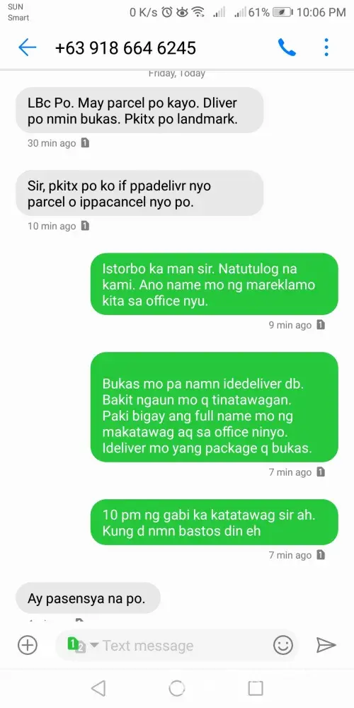 9:55pm tumawag ang nag pakilalang crew ng lbc, at itong call n ito na kina cancel q, pagkat natutulog na kami. Hanggang inulit nya ang ang tawag at naka tatlong tawag sya sa dis oras ng gabi. Kincancel q lahat ang tawag nya. Saka q sya nireplyan.. Na gabi n ito. Bukas mo pa namn idedeliver ung item, bakit k ngaun tumatawag sa dis oras ng gabi.