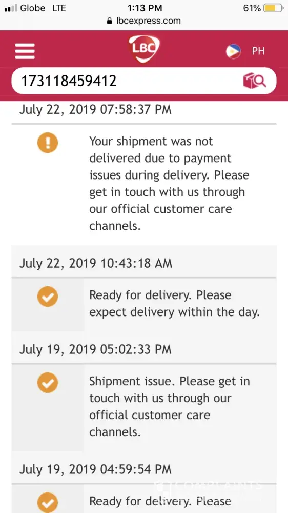 Hi, i would like file a complain against your company. Here's what happened my boyfriend had a transaction with your LBC branch at silang, cavite. and he had a package pick up from binangon rizal. it's a "payment upon pick-up" process and ineexpect nya na package ay 3DS and little did he know that package is not what he's expecting ang nasa box ay GLOBE router na naka box. May transaction sya with a seller sa Carrousell na app and he's name is Roy, San Jose and ginamit pa yung company nyo para makapag scam, aren't you gonna do anything about it? dapat nga bago ipadala i-declare muna yung package eh para specific and clear. he deposited 3k upon payment, and sinasabi lang ng mga taga LBC na process na daw sa system wala ng magagawa, is that how your company works? please please do something about it. it's not only about the amount deposited eh, how poor your company process packages works, ganun ganun lang magpa process? PLEASE this is so disappointing and birthday pa naman ng boyfriend ko today tapos ganyan mangyayare, kung person to person lang transaction eh, eh kayo yung middle man tapos you guys let this happened. tapos i called customer care and all dinidiin pa yung shipper na lang kausapin, ano wala talaga kayong magagawa? like wtf kahit man lang i hold yung payment? para di mapunta sa scammer