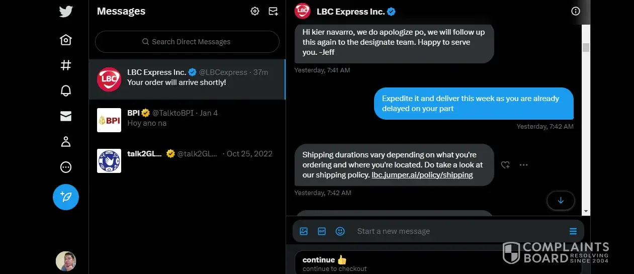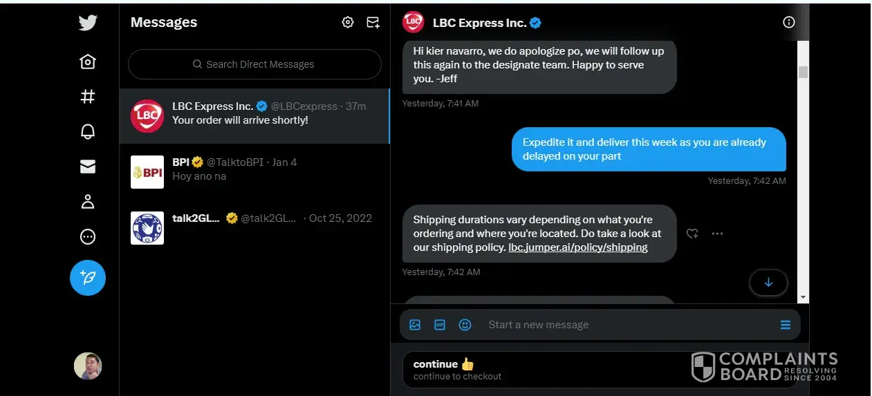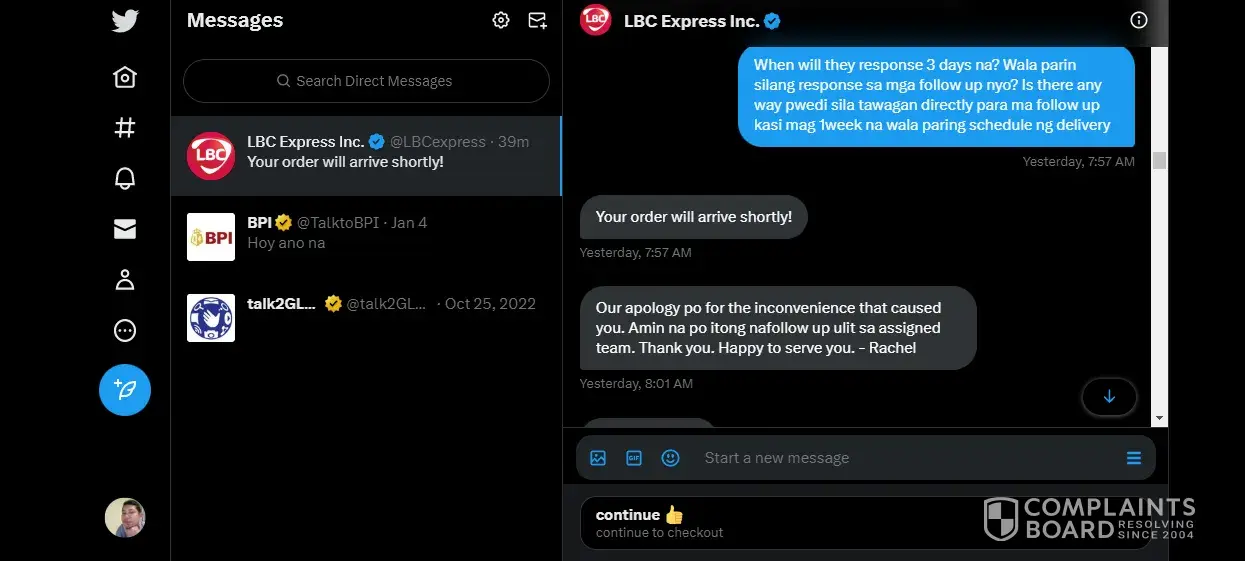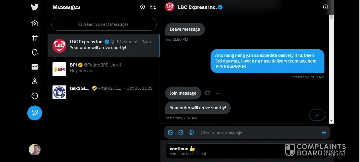My complain is Yung bdo credit card ko dumating na pala Wala man lang text or any update from LBC then sa tracker and sa customer service nila nagpapasapasahan lng cla Kung sino lalapitan Kung Hindi pa ako pumunta sa bdo ndi ko pa naayos Yung problema.