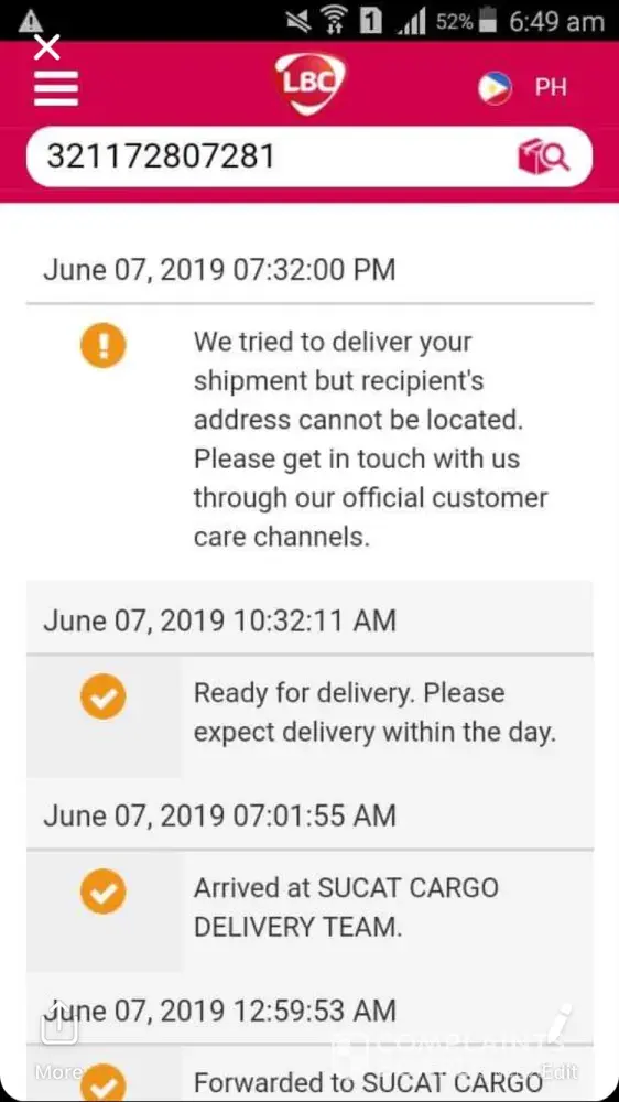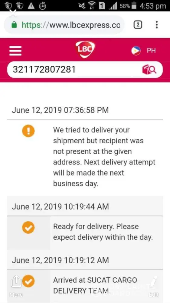 June 12, 2019 when the parcel arrived at SUCAT Cargo delivery team, and it is ready for deliver at 10:35AM (based on the tracking of LBC, please see attached file). June 12 tumawag ang LBC sa recipeint dahil di malocate ang address, and at the end of their conversation sinabi ng LBC na ideliver na yun sa mismong araw. Ngunit walang dumating...