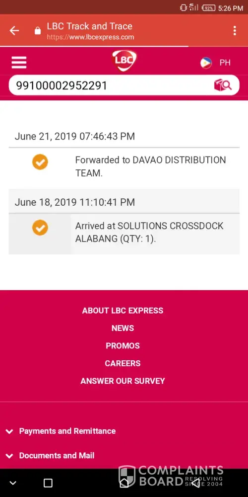I have a parcel shipped via LBC and the consignee paid using Cash On delivery amounting P5755.00. According to them, Remit to Account only takes 1-3 days after parcel is received. The Parcel was delivered Jun 10 and until today, Jun 25 the payment is not remitted to my account. If I did not check this payment was not remitted, I wouldn't know that I lost P5, 755.00. I have called LBC hotline 6 times, but they kept saying that they will need to Check. My last call was Jun 24 with the OIC named Michelle Ardalles, even promising to call me back the same day to update me, but no one called.