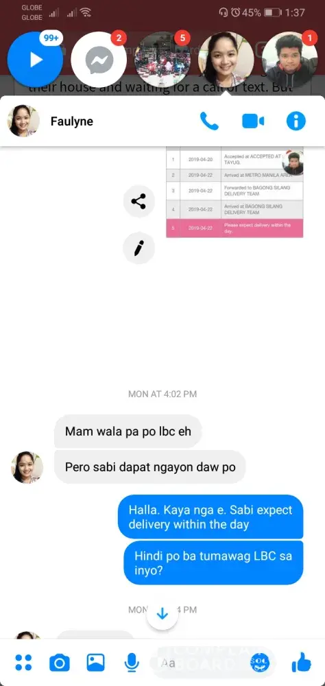 I was expecting to receive some delivery last April 24 kaso I was out of town kaya nag instruct na lng ako sa ate ko na siya ang mag receive kasi paid na yung freight. Sabi ng delivery guy hindi daw nya idedeliver kasi may babayaran pa. Pero sinabi ko na binayaran na yun, hindi niya binigay yung item. On the next day, try daw niya ideliver ulit. Pero sinabi ko sa branch ko na lng kukunin kasi nagkasakit ako, mga friday na ako makakabalik ng cebu. Heto, pumunta ako sa gaisano grand jai alai branch ng lbc para kunin yung item pero sabi dun wala ng denilever. Nagtext ako sa delivery guy tapos nagreply siya na nasa main daw yung item ko. Hopefully makahelp kayo rito. Thanks