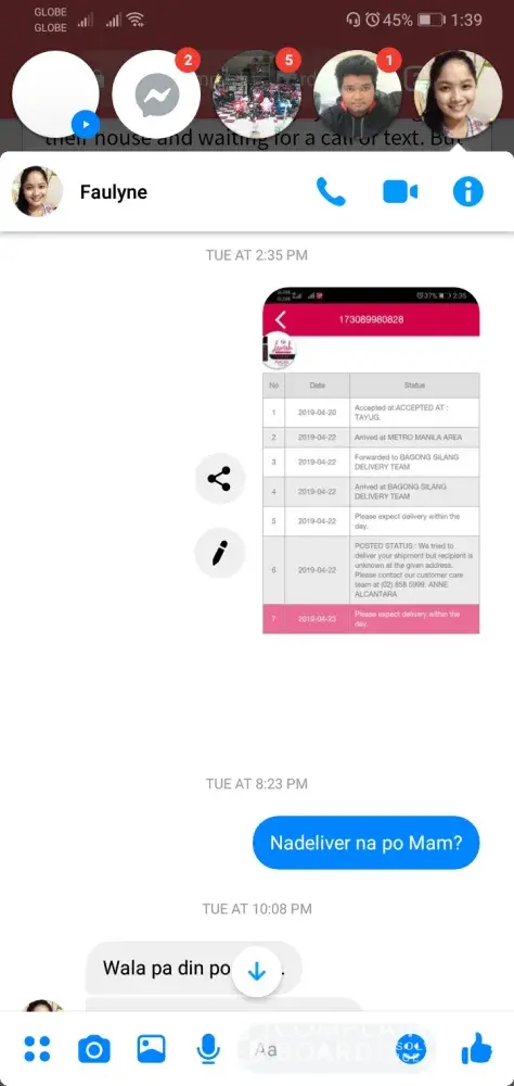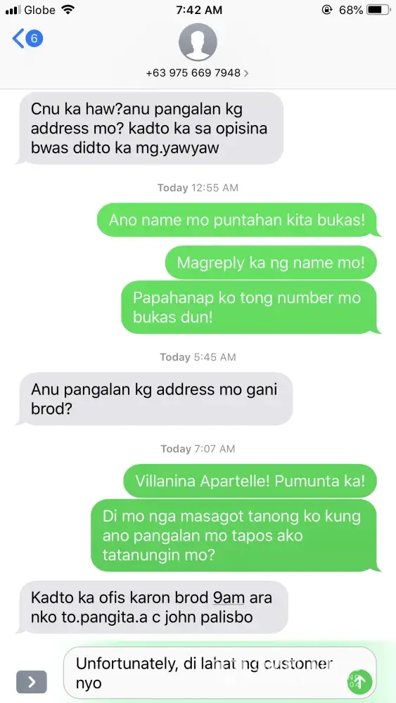 Earlier today, I texted him back about the inconvenience he got me in. He responded and even called me. I also tried to ring him. The irritating part was when he called me ‘gago' - thy to me is unjust vexation. He keeps on insisting that i go to their branch. So, I told him it is up to him if he's going to deliver the parcel or not.