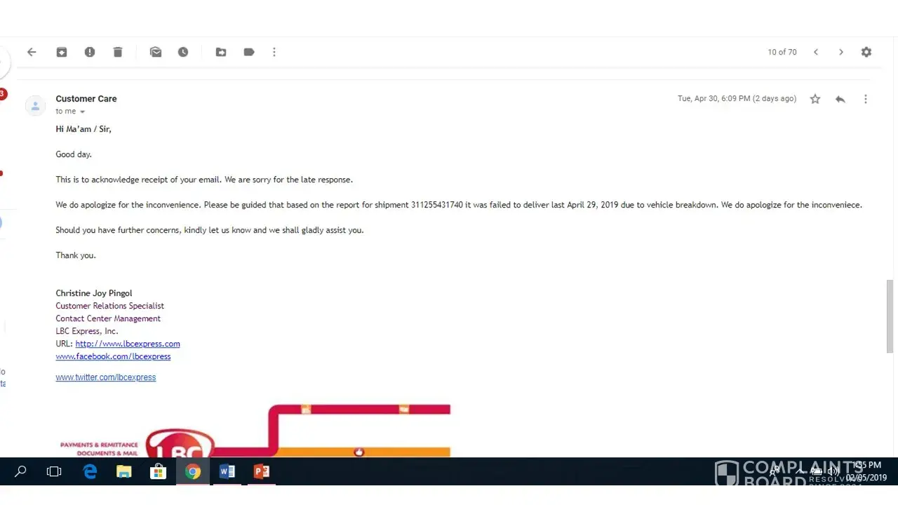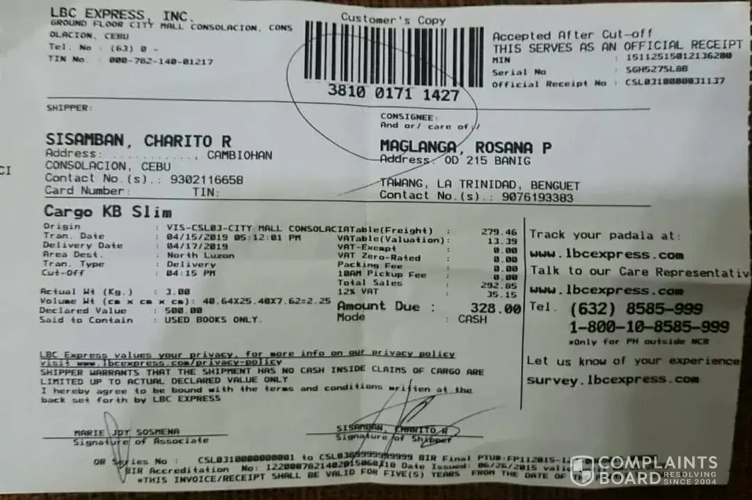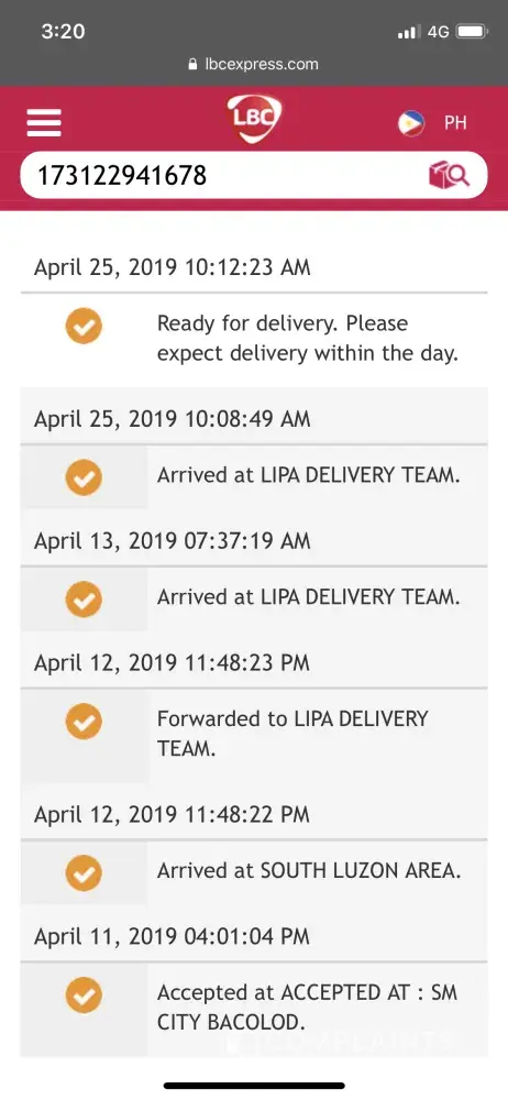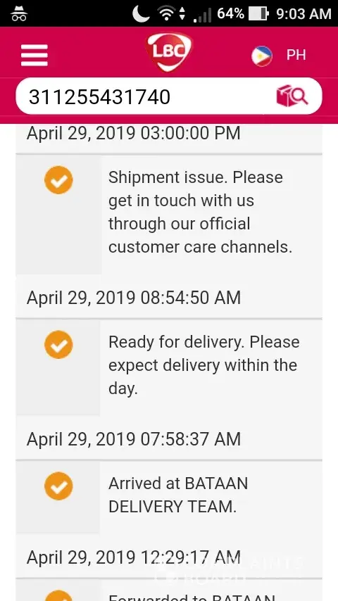 I am writing this letter of complaint on behalf of my client too, who was expecting to receive the parcel on April 29, 2019 by the LBC Delivery Team of Bataan (See attached).