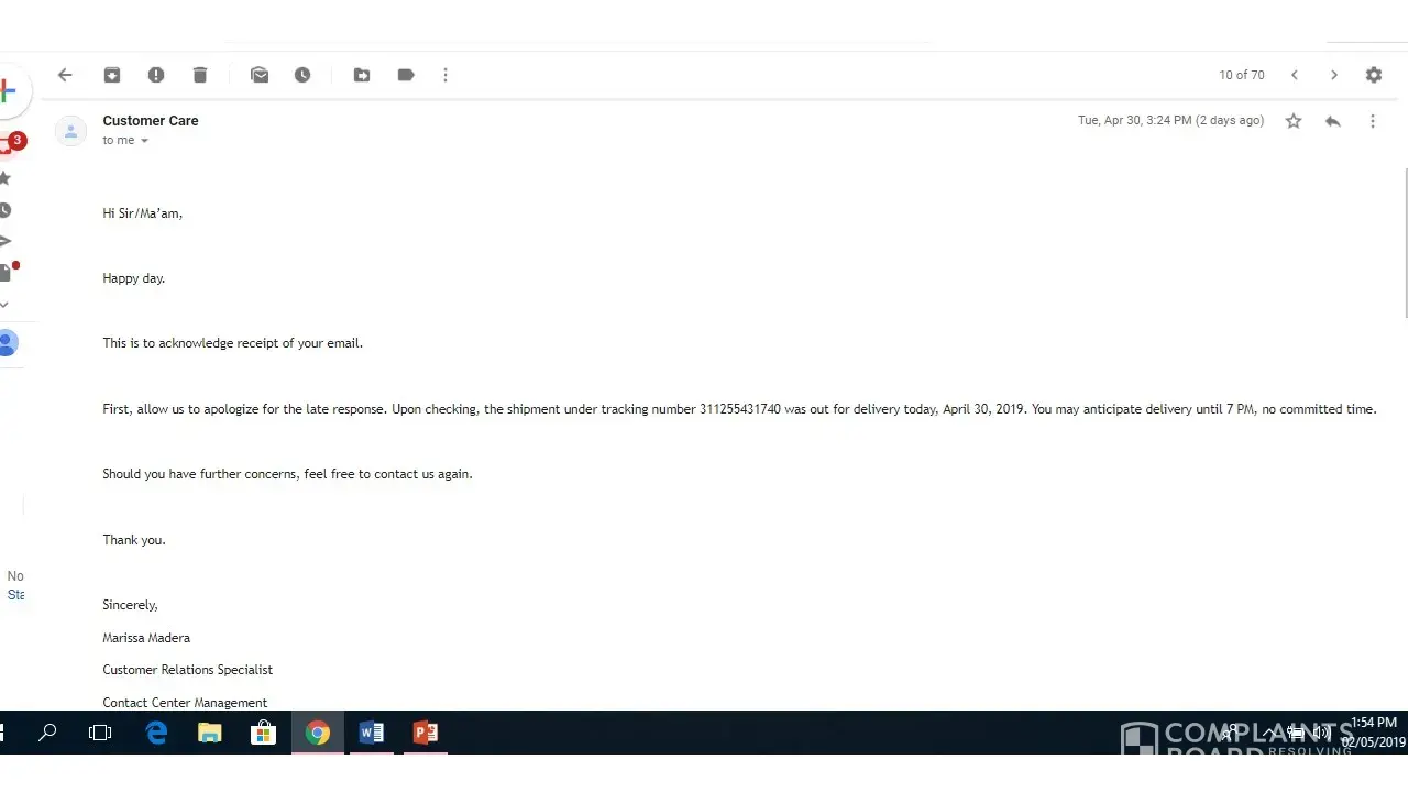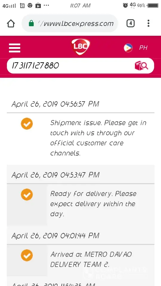 On April 30, 2019, at 7:24 a.m. it was tag "Ready for Delivery". We sent a message through your customer service and contacted the LBC branch in Limay, Bataan about the shipment issue on April 29, 2019. According from your Customer Service, the shipment issue was due to vehicle breakdown (See attached image). On the other hand, they assured as that the parcel will be delivered on April 30, 2019 until 7:00 p.m. However, the parcel was not delivered again by the LBC delivery team on the said date. We checked from your website on the status of the parcel, but there were no reports made.