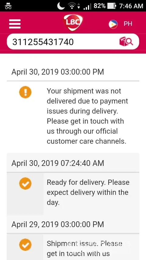 Early on May 1, 2019, we found out from your Track and Trace dashboard that the parcel was tag "Shipment was not delivered due to payment issue during delivery" on April 30, 2019 at 3:00 p.m. (See attached image in Figure 1). My client waited the entire day for three (3) consecutive days already for the LBC delivery team to arrive at the addressed specified in the box. Neither did the LBC delivery team deliver nor contacted the recipient of the parcel, given that the phone number is well-provided. There was never any communication made by your LBC delivery team of Bataan to our client at all.