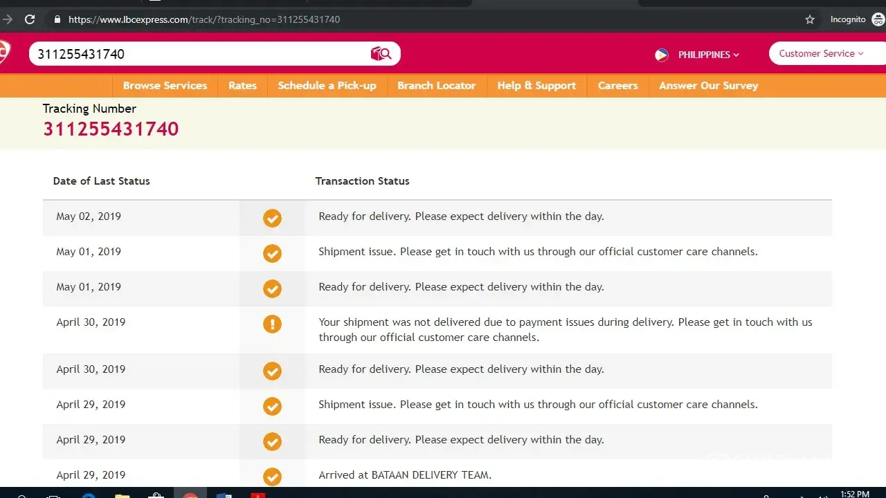 A parcel with the Tracking Number [protected], bound to Limay, Bataan, was scheduled to be delivered on April 29, 2019. But it was reported with "Shipment Issue" at 3:00 p.m. on that same day.