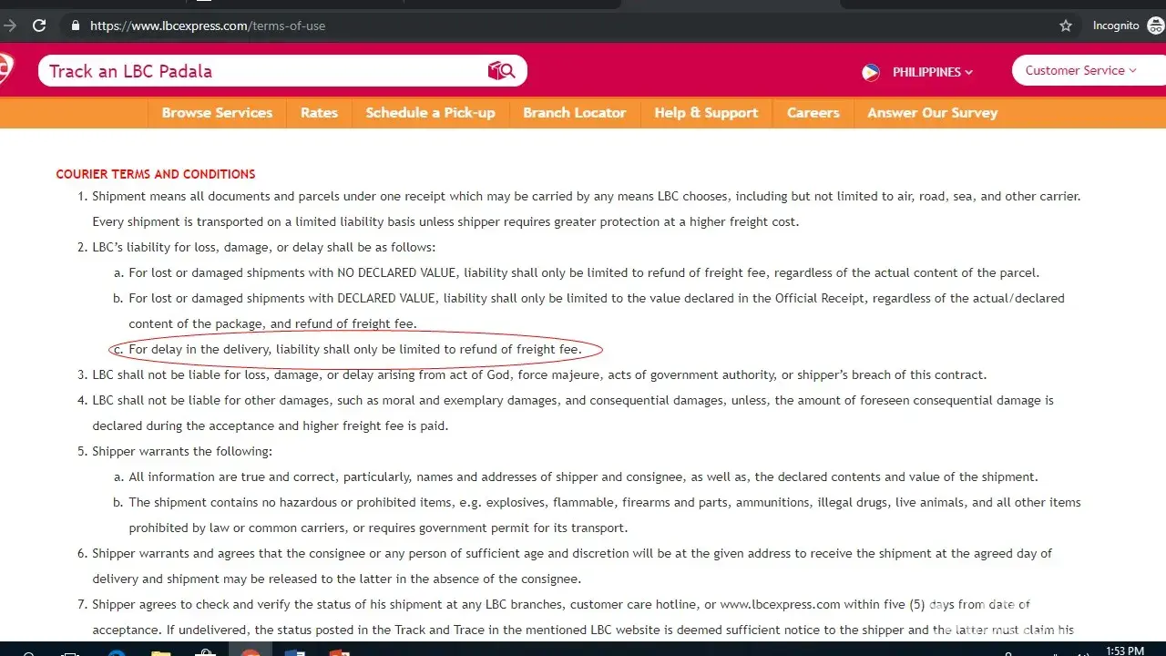 This kind of services must be put to an end and I demand for an investigation on the LBC Delivery Team of Balanga, Bataan. Furthermore, I demand for a REFUND of the freight fee for delayed delivery. (Refer to Courier Terms and Conditions No. 2.c.)