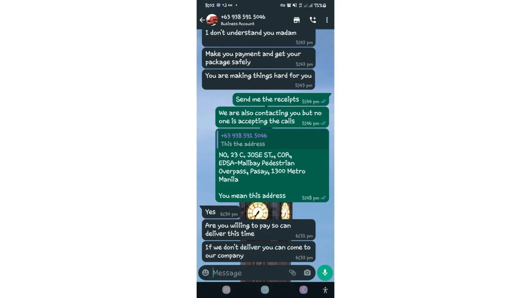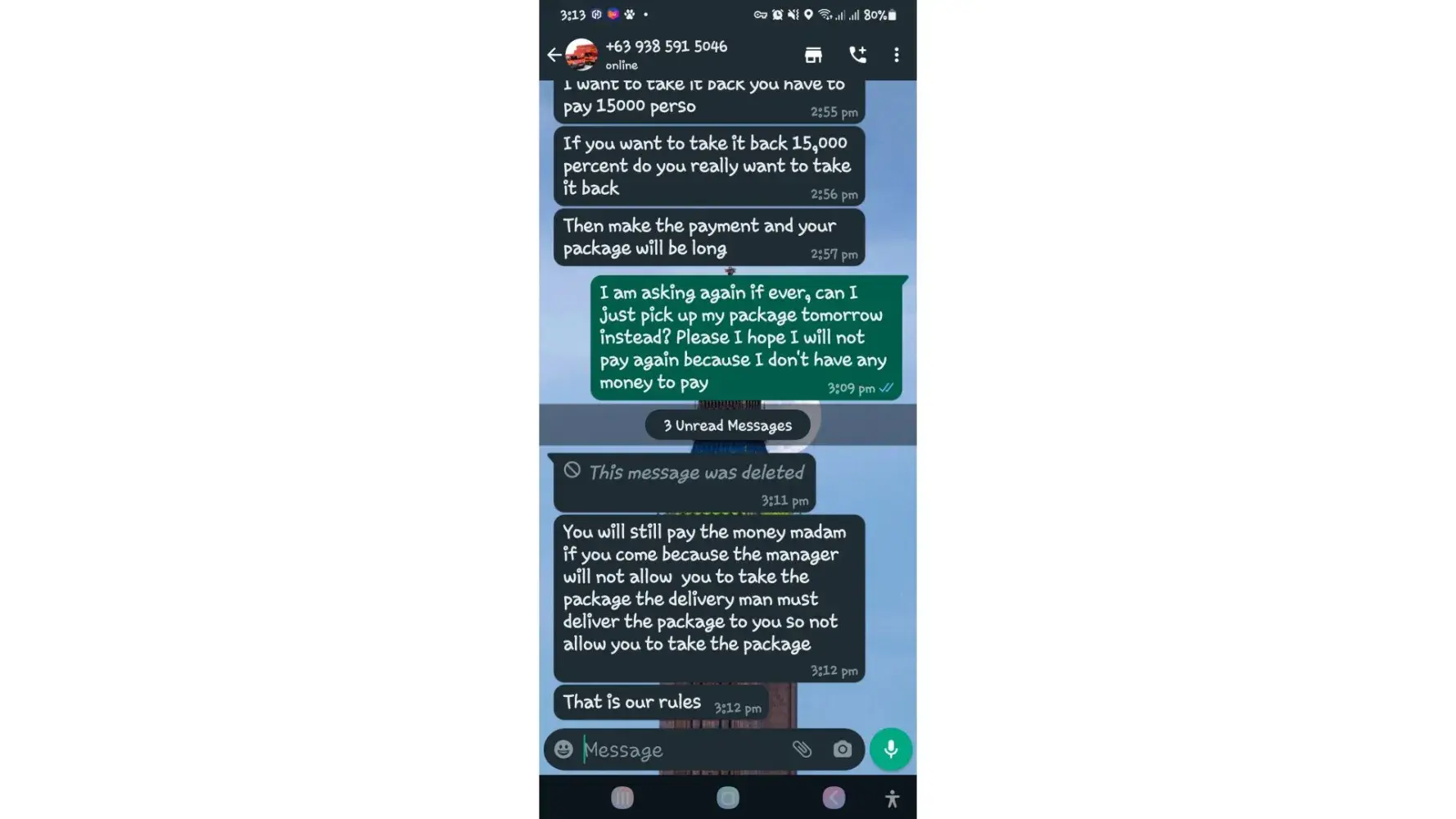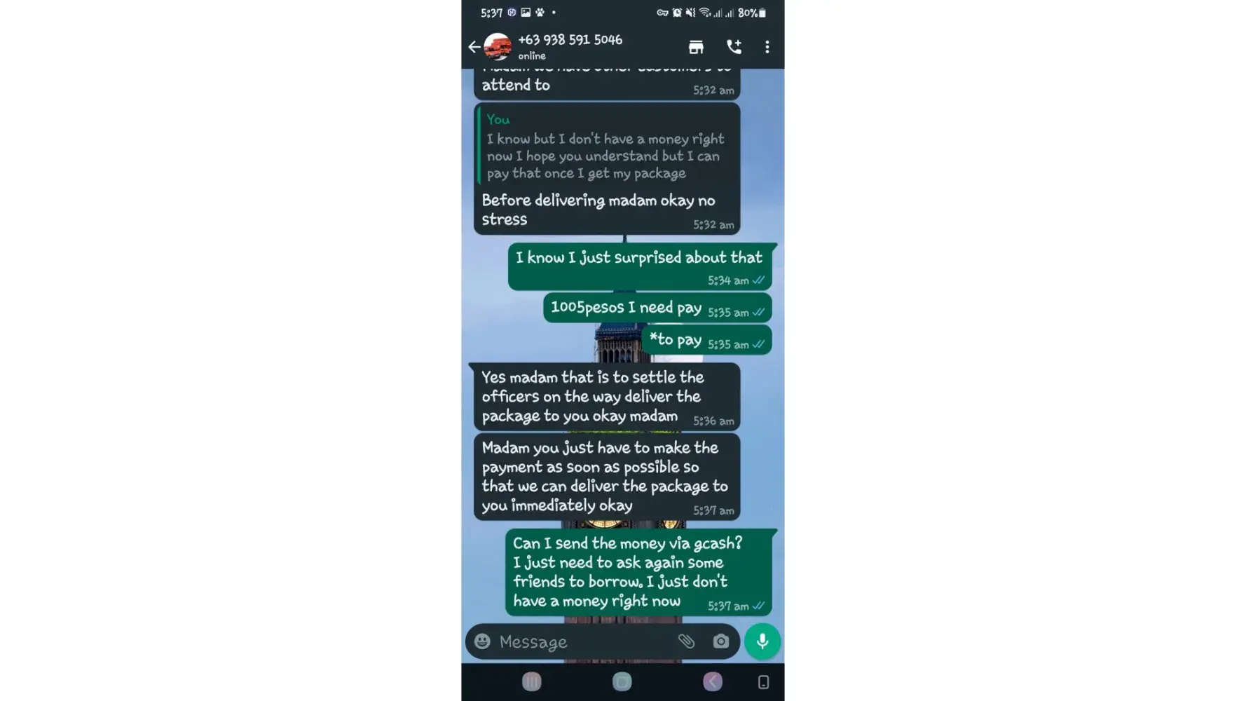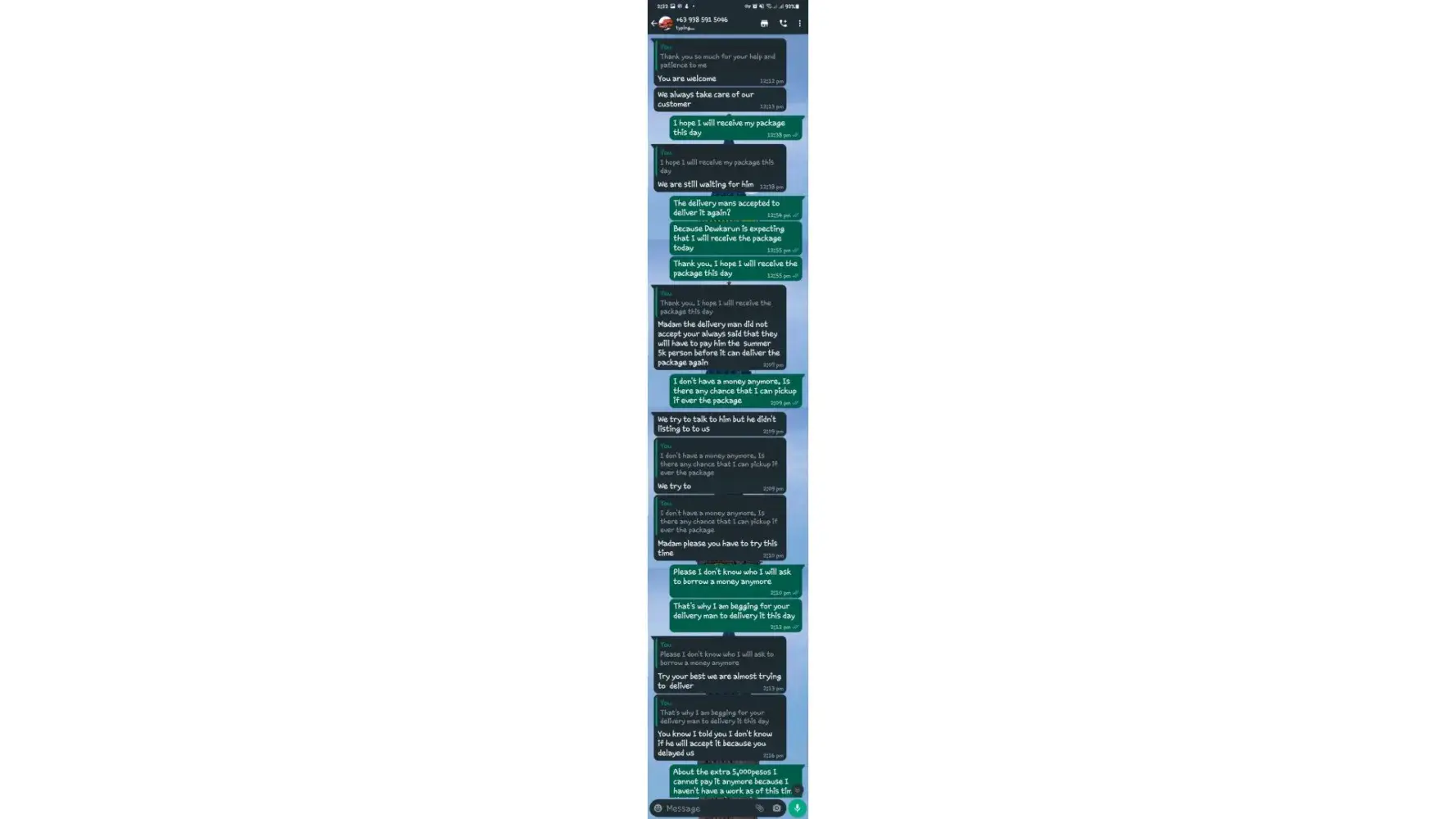One of lbc agent sent me a message on my whatsapp number telling that my package is already arrived last january 25, 2023 @4:33am and they are asking me to pay the custom clearance worth 3,000pesos immediately. I already paid that last january 27,2023 @8:13pm then last january 28, 2023 @5:15am they sent me a message again they are asking me to pay for the delivery charges for 1,000pesos and they said that is my last payment and they assured it to deliver my package and I find a way just to pay it today, january 31, 2023,@8:47am but they said its not 1,000pesos anymore because I need to pay 2,000pesos now instead of 1,000pesos for the first payment they are asking for just the delivery charges. Until now they are still holding the package they are asking for more money that they want me to pay more its now worth 5,000pesos just to deliver my package they said the delivery man is not going to accept my package just to deliver it again that's why they are demanding for more money so they can deliver it to me. They are scamming me! They gave me a 2 options I need to pay 5,000pesos just for the delivery charges or I will pick it up but they said that I still need to pay them again before they will release my package.