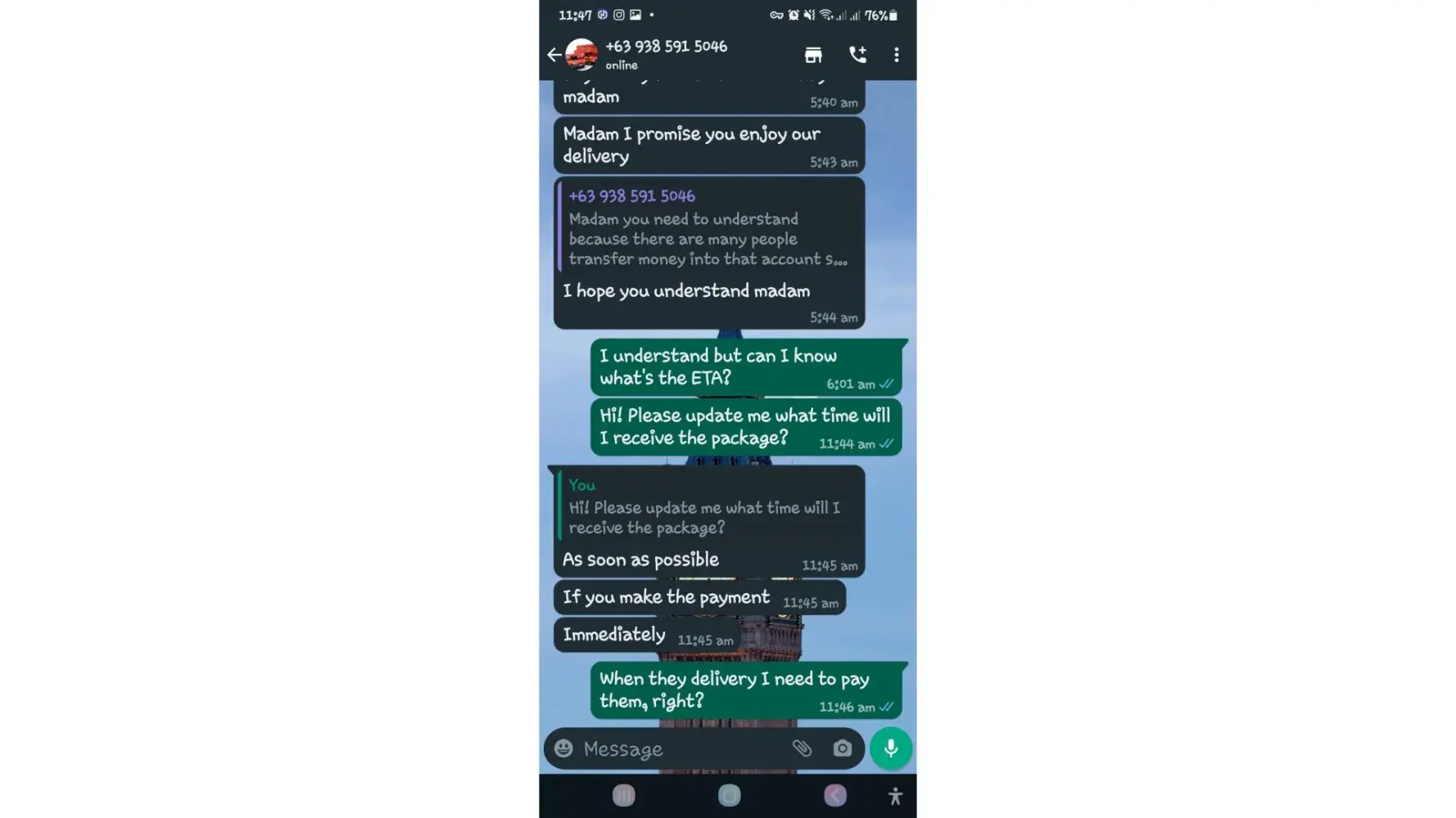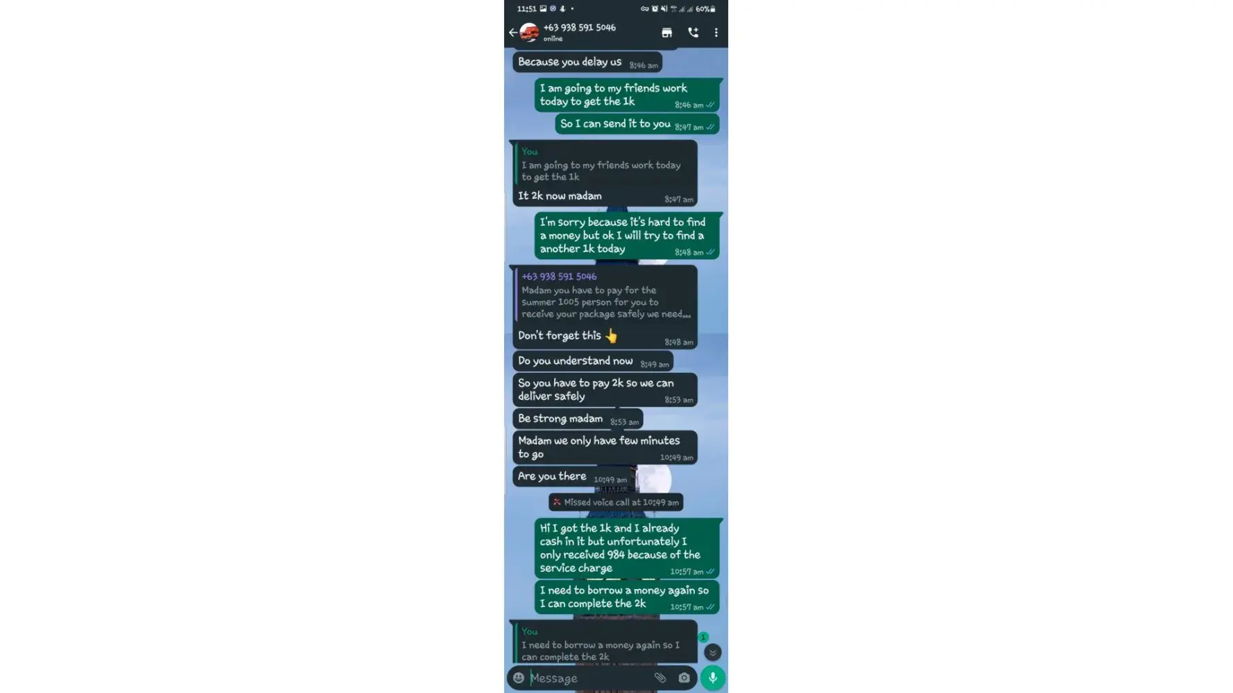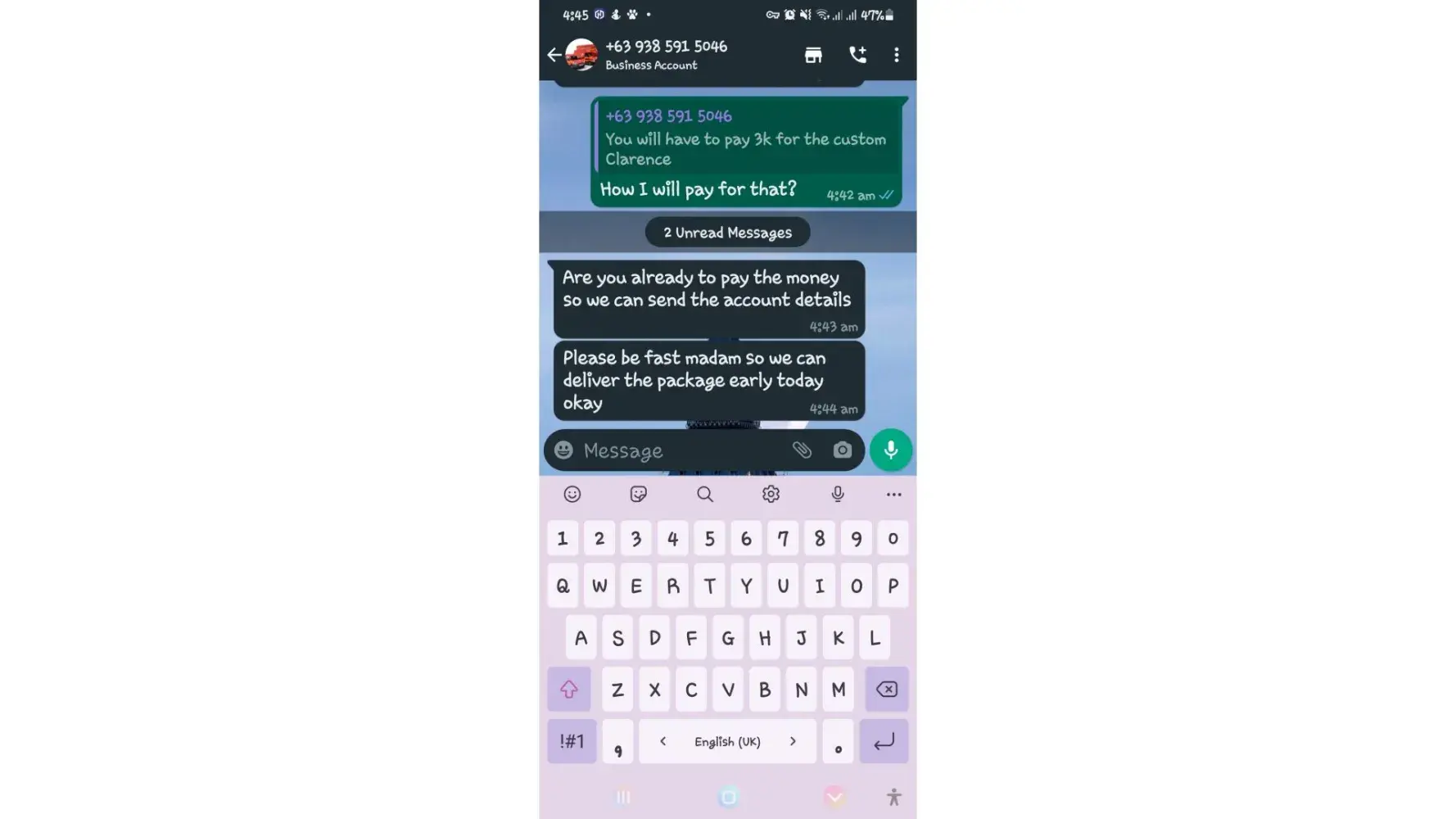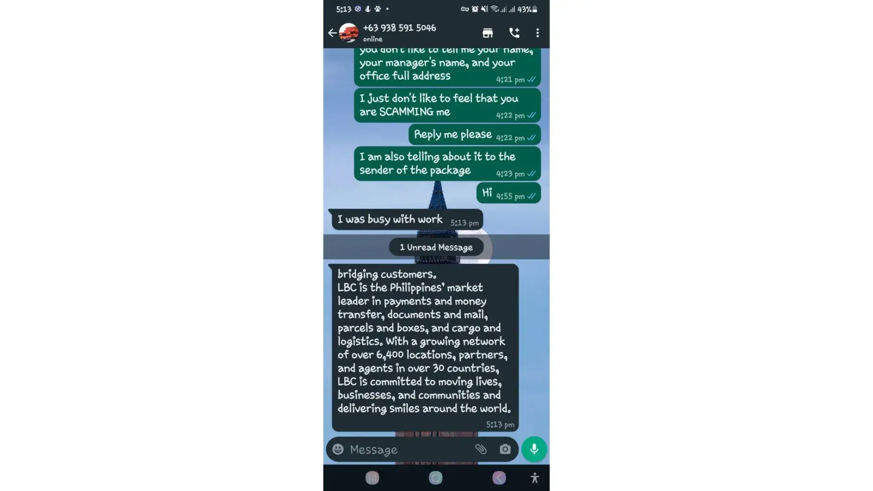 One of lbc agent sent me a message on my whatsapp number telling that my package is already arrived last january 25, 2023 @4:33am and they are asking me to pay the custom clearance worth 3,000pesos immediately. I already paid that last january 27,2023 @8:13pm then last january 28, 2023 @5:15am they sent me a message again they are asking me to pay for the delivery charges for 1,000pesos and they said that is my last payment and they assured it to deliver my package and I find a way just to pay it today, january 31, 2023,@8:47am but they said its not 1,000pesos anymore because I need to pay 2,000pesos now instead of 1,000pesos for the first payment they are asking for just the delivery charges. Until now they are still holding the package they are asking for more money that they want me to pay more its now worth 5,000pesos just to deliver my package they said the delivery man is not going to accept my package just to deliver it again that's why they are demanding for more money so they can deliver it to me. They are scamming me! They gave me a 2 options I need to pay 5,000pesos just for the delivery charges or I will pick it up but they said that I still need to pay them again before they will release my package.