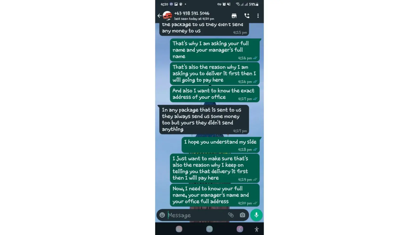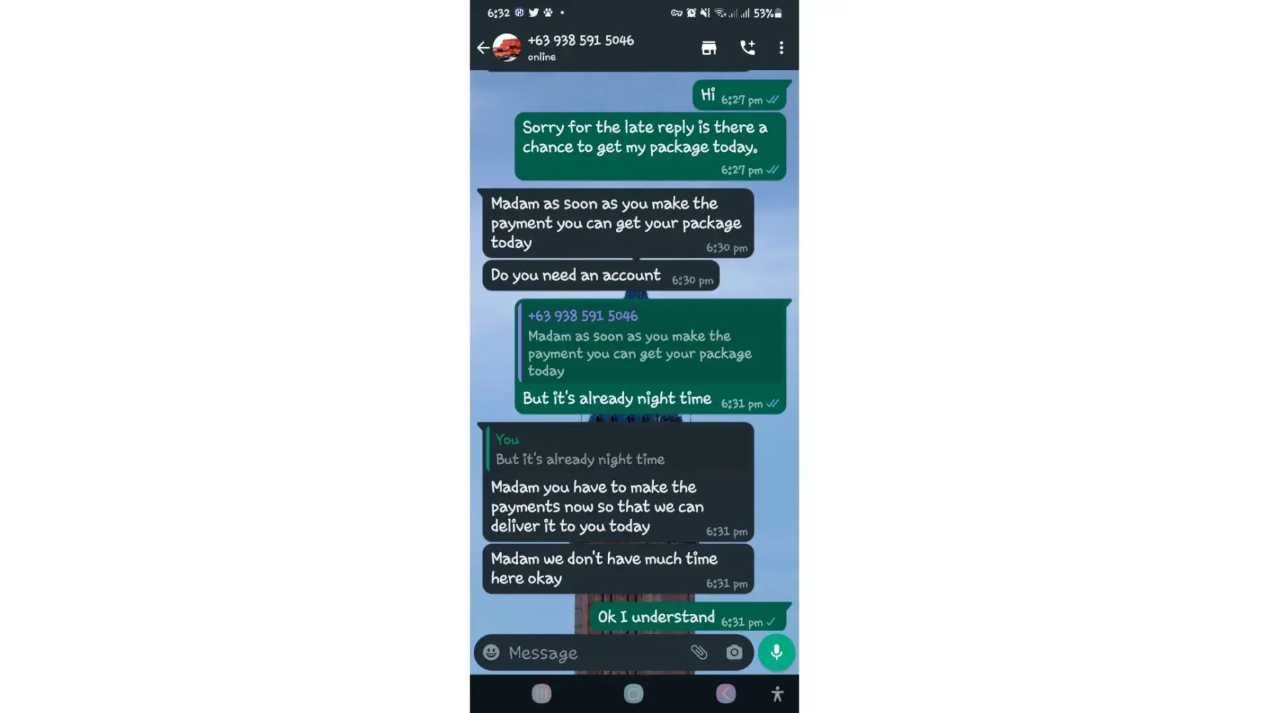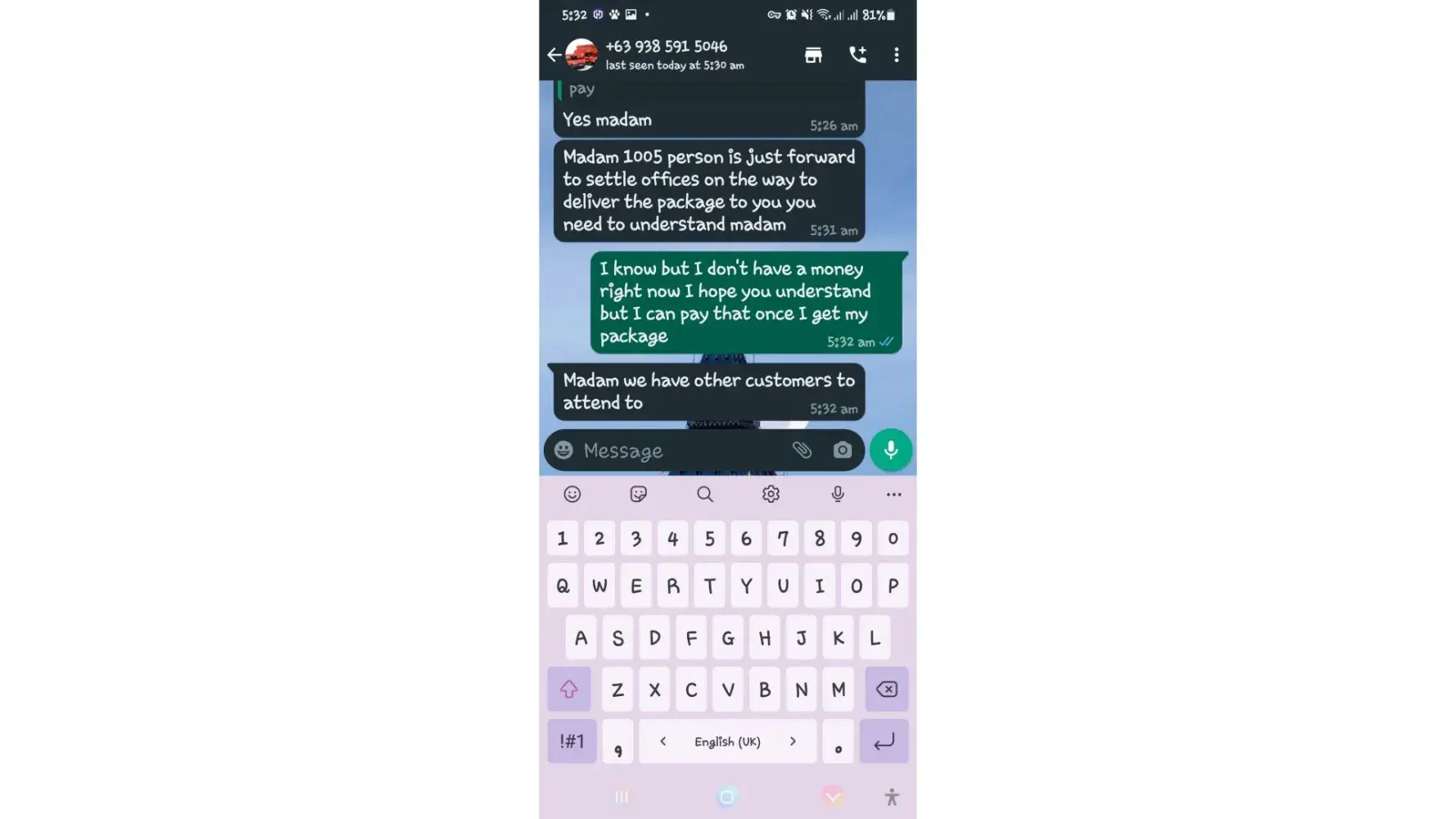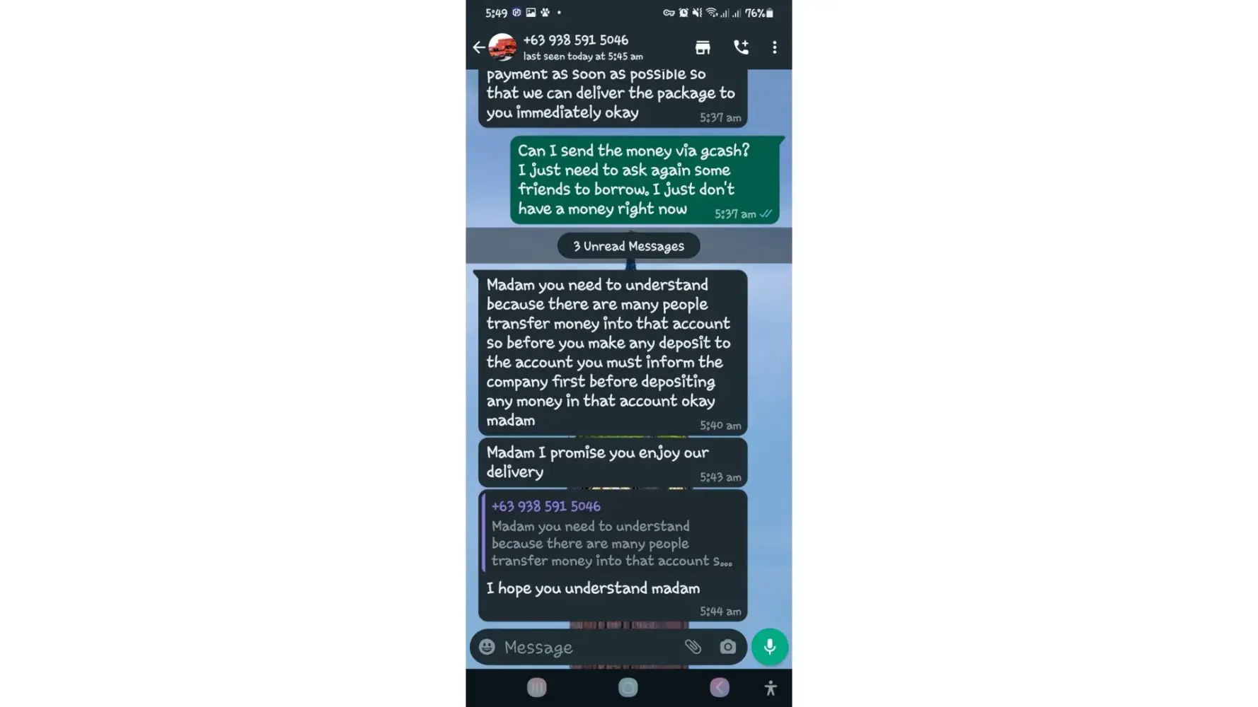 One of lbc agent sent me a message on my whatsapp number telling that my package is already arrived last january 25, 2023 @4:33am and they are asking me to pay the custom clearance worth 3,000pesos immediately. I already paid that last january 27,2023 @8:13pm then last january 28, 2023 @5:15am they sent me a message again they are asking me to pay for the delivery charges for 1,000pesos and they said that is my last payment and they assured it to deliver my package and I find a way just to pay it today, january 31, 2023,@8:47am but they said its not 1,000pesos anymore because I need to pay 2,000pesos now instead of 1,000pesos for the first payment they are asking for just the delivery charges. Until now they are still holding the package they are asking for more money that they want me to pay more its now worth 5,000pesos just to deliver my package they said the delivery man is not going to accept my package just to deliver it again that's why they are demanding for more money so they can deliver it to me. They are scamming me! They gave me a 2 options I need to pay 5,000pesos just for the delivery charges or I will pick it up but they said that I still need to pay them again before they will release my package.