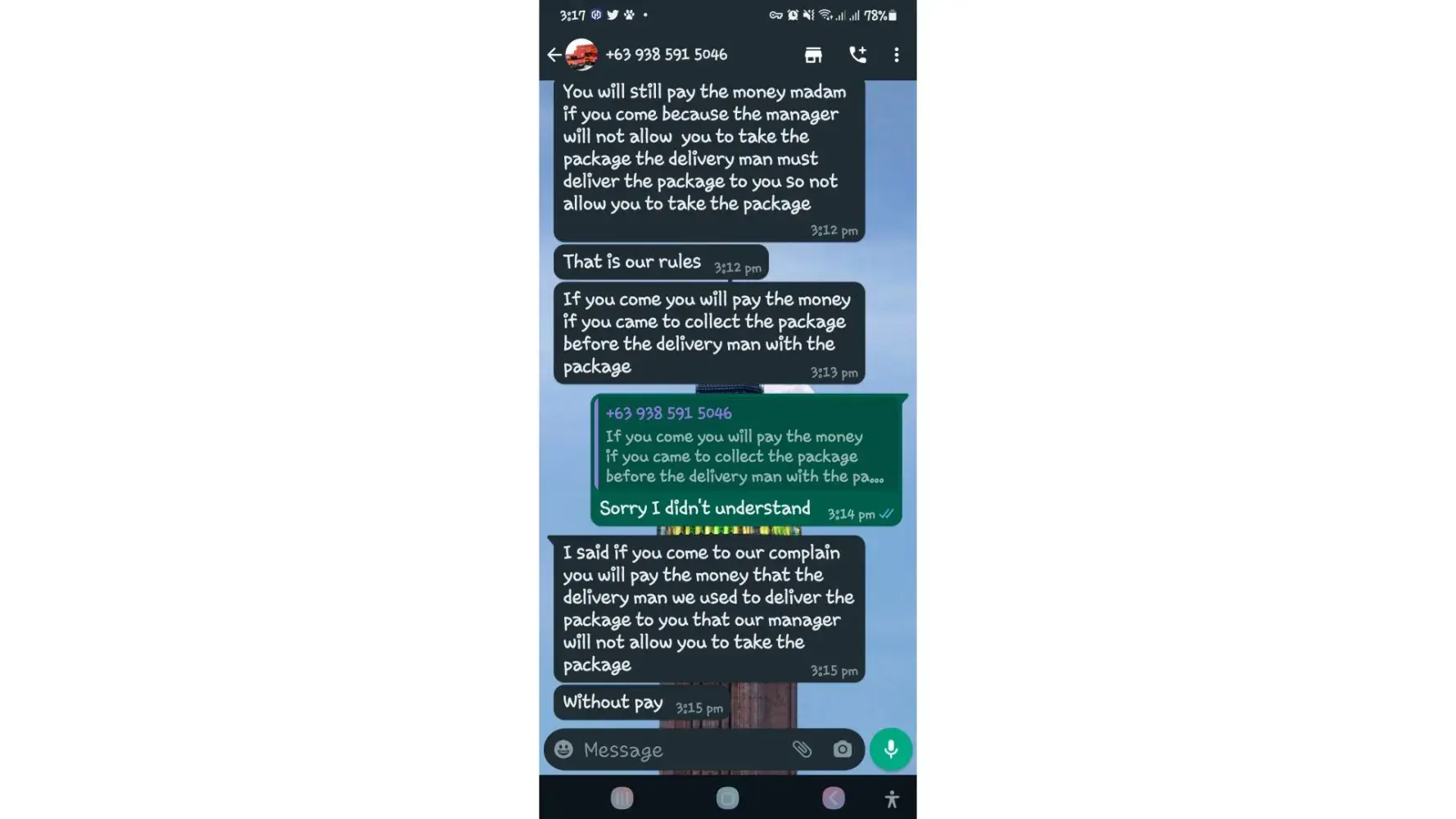 I asked them if ever I didn't paid for the delivery charges and send it back to the sender instead because I cannot pay for it. They said, I need to pay 15,000pesos more just to return the package to the sender.