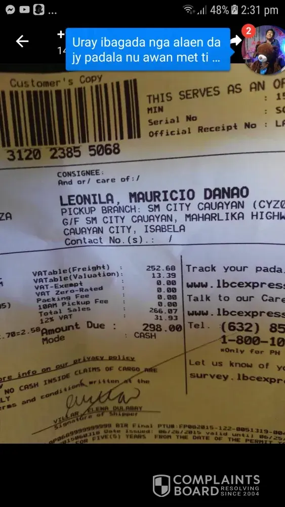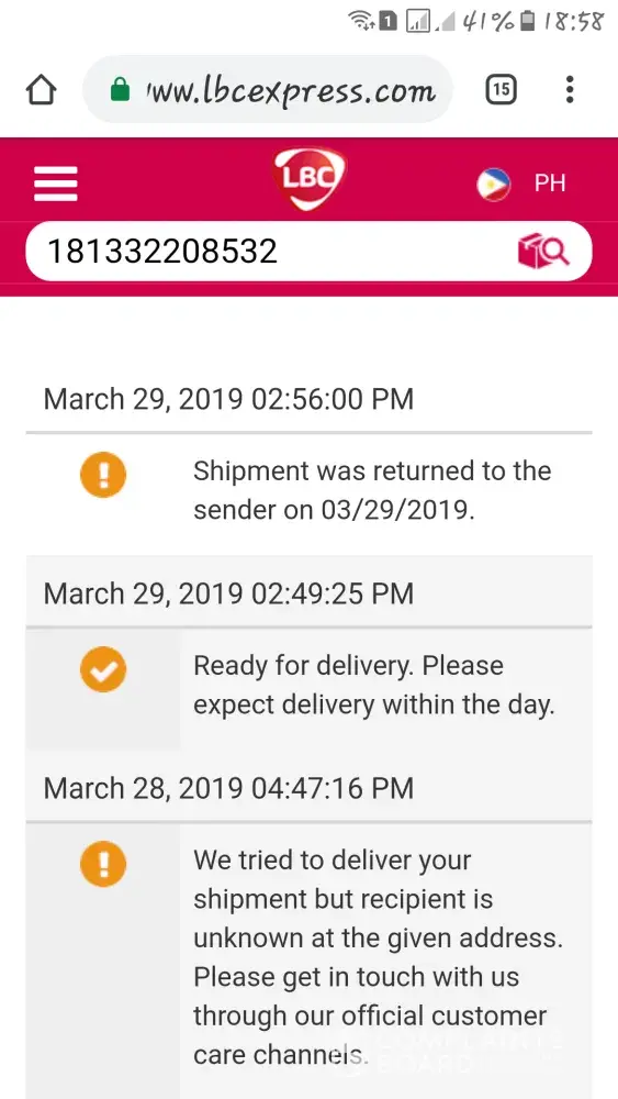 Im from noveleta cavite last march 7 I sent a small kb box containing 10bottles of body spray, a shoes and towels thru you lbc going to coron palawan with a tracking no.[protected], the tracking update says it was on puerto princesa the next day and expect the deliver within the day, how can I expect my box to be delivered within that day when it was sea-away from my delivery address! Puerto is ocean away from coron for god sake, your delievery is wrong! And then it shows! Tracking update says shipment issue, and to cantact your customer service hotline chuchu! Until now march 28 my sister from coron palawan did not recieve any box from you yet!.. Customer service called me to inform that my box will be sent back to manila before sending it to coron! So I decided to take back nalang my box and refund my frieght fee! I went to the branch where I sent my parcel last tuesday march 26 and my box were not there yet!? And the agent doesnt know when it will arrive to the branch! So can somebody tell me what happened to my box?.. And where is it?! When will I have it?! Its been 3 weeks already for crying out loud!.. If you cant give me my box today! Pay my declared valaue and refund my fee! You have been caused me so much inconvenience and I cant wait for the box any longer, the shoes has been paid already 3 weeks ago by our customer because that box are our little business! Some of the body sprays has been paid reserved but our customer refunded due