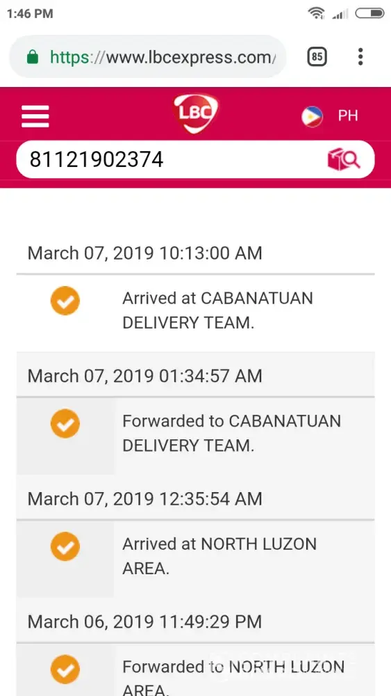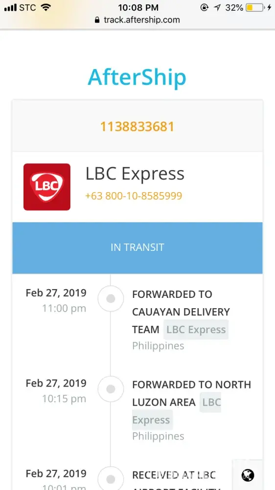 Package sent thru lbc branch in commonwealth to be shipped to tondo manila only. It's already March 14 and still, package was not delivered with last update on Mar 4th! Poor customer service too when we called hotline.