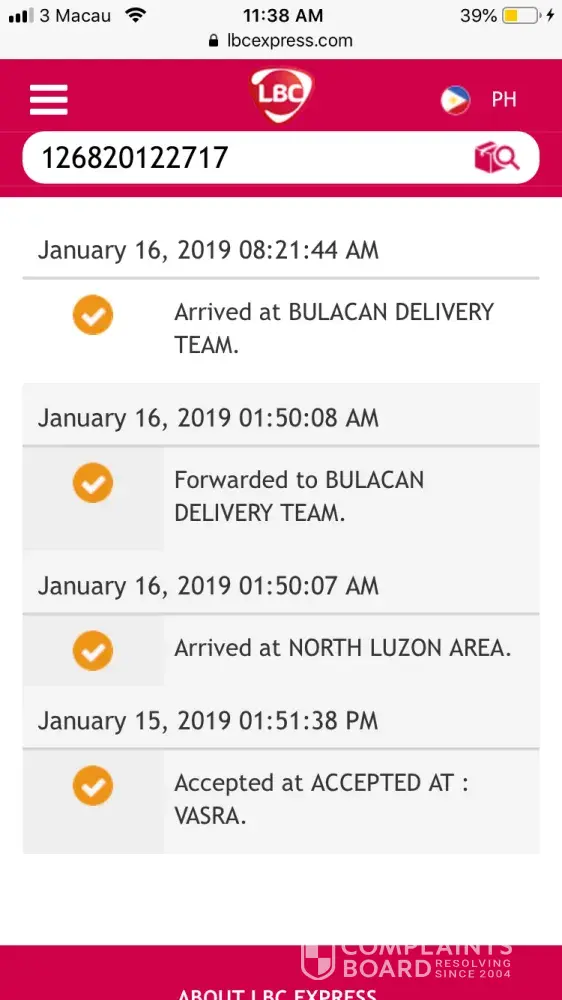 LBC EXPRESS!im so disappointed with your service because until now my parcel is not yet delivered, January 5, 2019 when my parcel is being ship but until now I didn't recieved it, even in your online tracking the updates is still the same..Whats wrong with your service!Please give me an exact details and updates regarding to my parcel as soon as possible or else I will report you to the Authority!