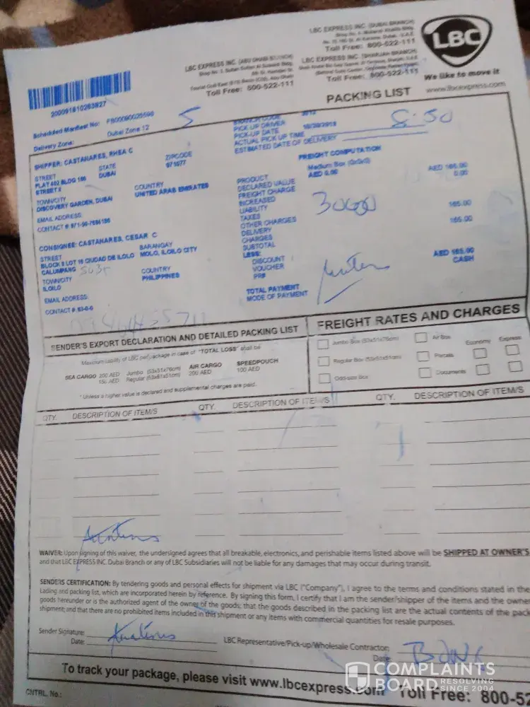 Secondly: My balikbayan box, some of the chocolates and spams were missing and I have not written all what was in the box but I'm pretty sure with the number of spam and that some chocolates are missing as I have written instructions to my sister who will be receiving each one the goods. It may be small items that were missing but given the fact that it was my first time to send a box I am so disappointed and that the box arrived 3 months from home contrary to 7 weeks that they have told me. I would not be complaining if not because of the missing items. I have trusted the company and did not believe what I have seen in the social media but it really happened to me and now believe that LBC staff are opening boxes and taking items from the balik bayan boxes. It breaks my heart to think that others like me probably have experienced this.