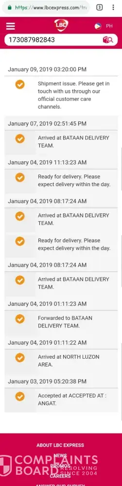 Hi LBC Express, I want to follow up my parcel with tracking number, [protected]. This was accepted last January 3, 2019 at Angat, forwarded and received at Bataan Delivery Team on January 4, 2019. On the same day, January 4, it was posted as ready for delivery but I don't receive the parcel. So, I'm waited until January 7, the website posted that the...