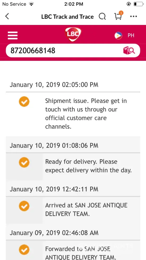 I am still waiting for my order from lazada through lbc express with tracking number [protected]. I have ordered it last dec 4, 2018 and it arrived at lbc express antique last january 10, 2019 with the same delivery date. How will I know the problem with my items? I have not received any text message from the delivery man. Hoping you will resolve this issue as soon as possible. Thank you!