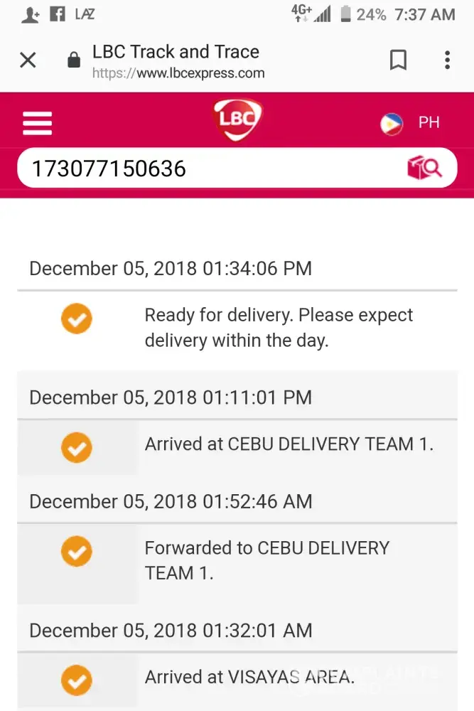 just wish that this issue of late delivery of packages will be addressed. Before, I really admired the fast or next-day delivery by LBC provided the packaged is accepted within cut-off time. But lately, I already experienced receiving late deliveries several times. Like in the attached example, tracking says it was supposed to delivered yesterday but I have not received it yet.