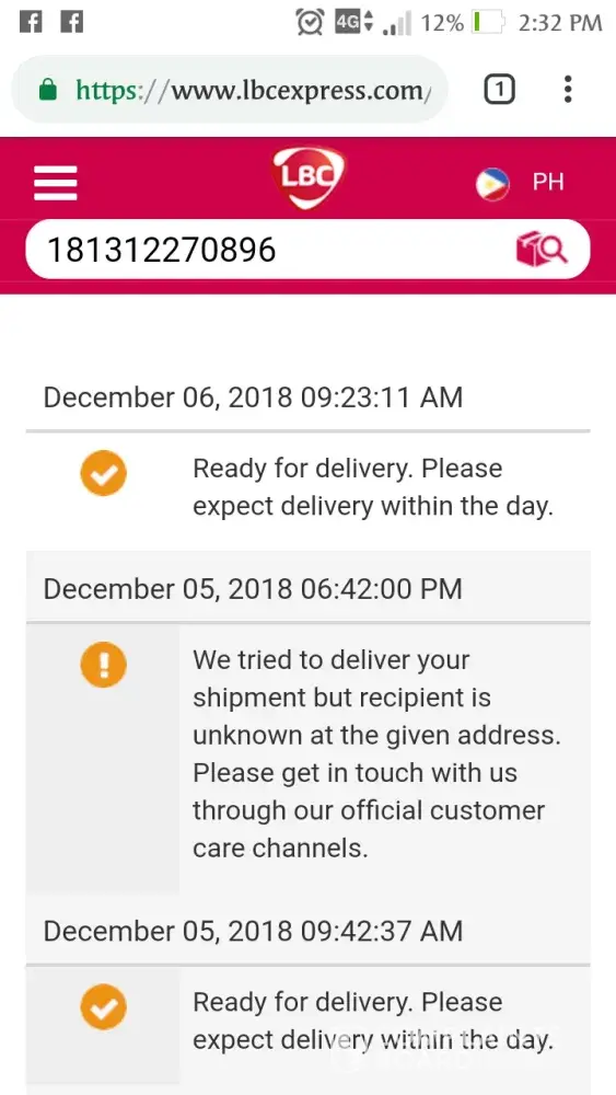 HELLO LBC, KALA PO NAMIN HARI KAYO NG PADALA? BAKIT GANUN? LAST DECEMBER 5, 2018 PA PINADALA UNG BAGAHE FROM MANILA TO PADRE GARCIA BATANGAS LANG UNTIL NOW WALA PARIN?! ETO CURRENT STATUS PERO DI PARIN NADEDELIVER SA TAO.