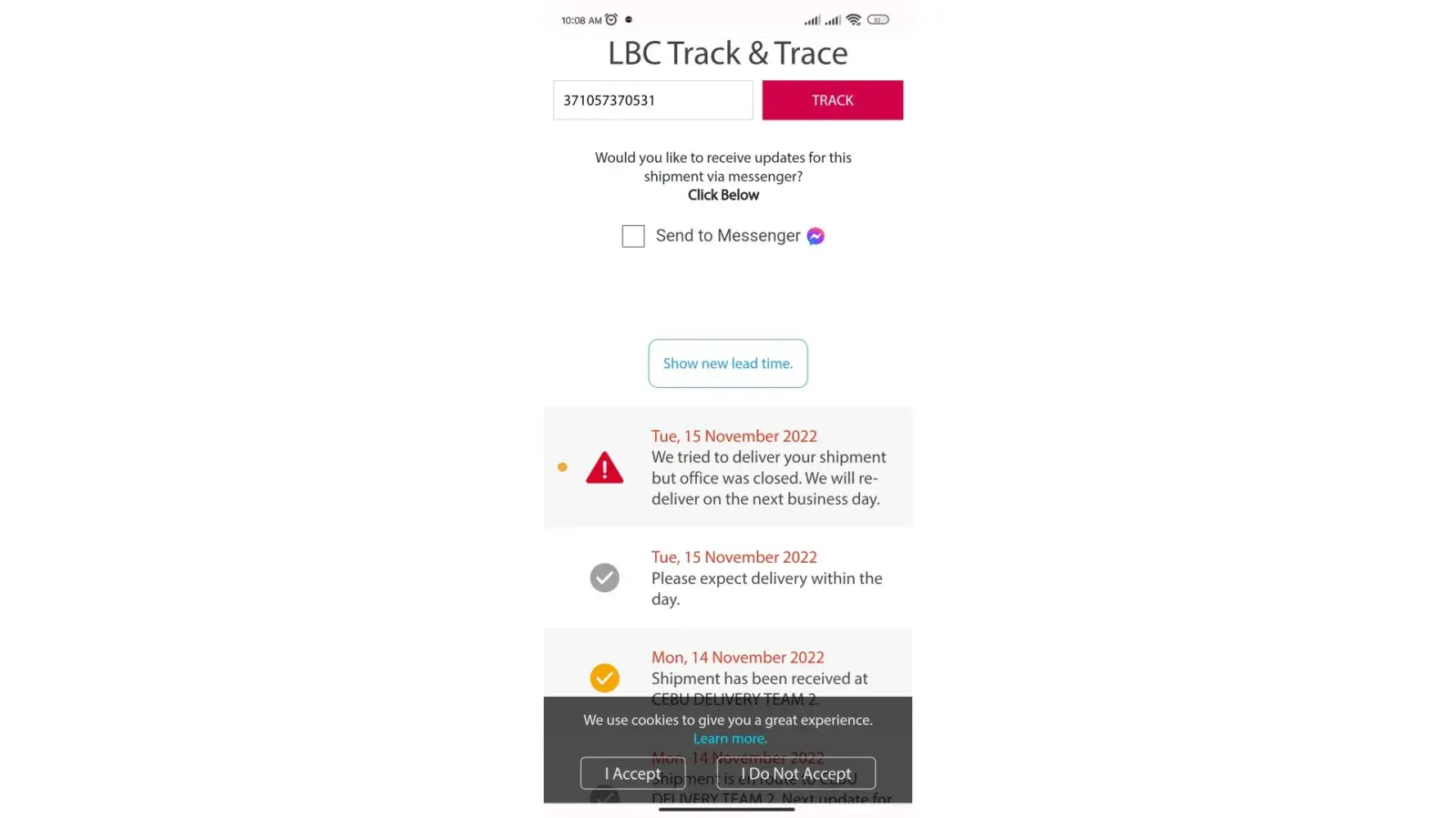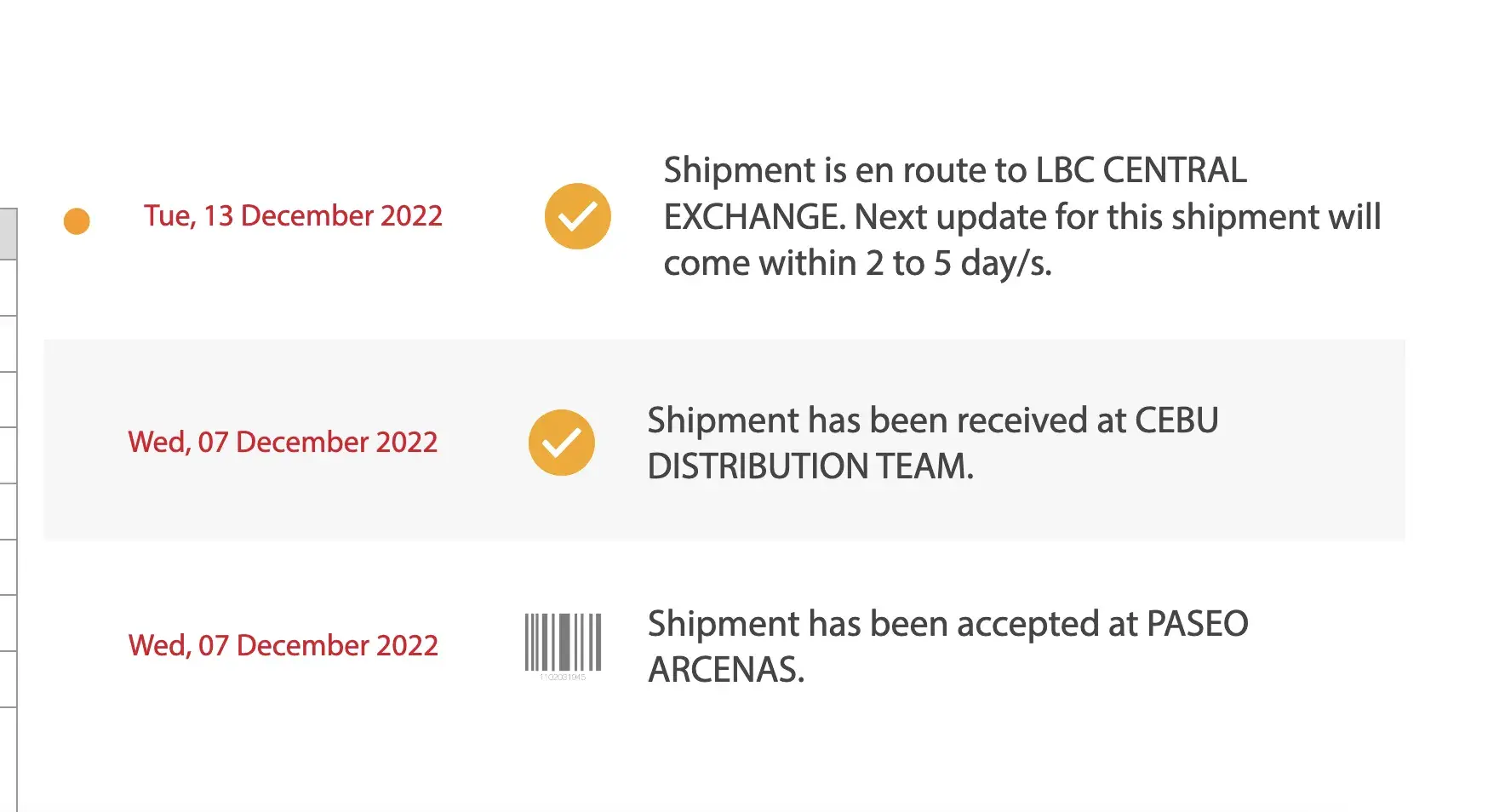 After persistent inquiries, it was only on December 13, 2022 that I got the update the parcel was en route to the LBC Central Exchange. Still, the latest movement included a disclaimer that the next update would take 2 to 5 days, which is an additional waiting time to the 2 to 5 days lead time of LBC express.