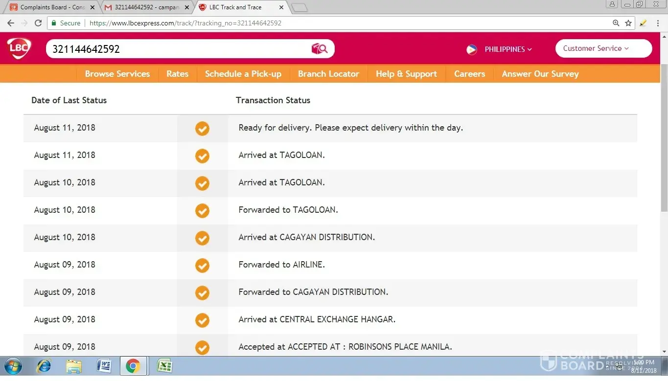Gusto lo lang ipaabot sa kinauukulan ang aking reklamo tungkol sa ipinadala kong pakete patungong lagawe ifugao, na nakapangalan kay miss Karen Cabbigat noong Aug. 9, 2018 na hanggang ngayon ay di pa natatanggap, inihulog ko sa Gerona branch, galit na ang buyer ko dahil walang napaparating na pakete, trinack ko ngayong oras na ito at lumalabas n di na i forward, bakit kailangang umabot ng halos isang linggo ang pakete na hindi kumikilos na di man lang ninonotify ang sender o ang receiver considering na both parties ay may cp no. Matagal na akong tumatangkilik sa lbc pero dismayado ako sa serbisyong hindi maayos na maging dahilan upang masira ako sa iisang kliyente na magreresulta sa pagkasira ng pangalang na i put up ko regarding online selling, maliit na halaga pero katapat ang pagkasira ng buong pagkatao ko.
