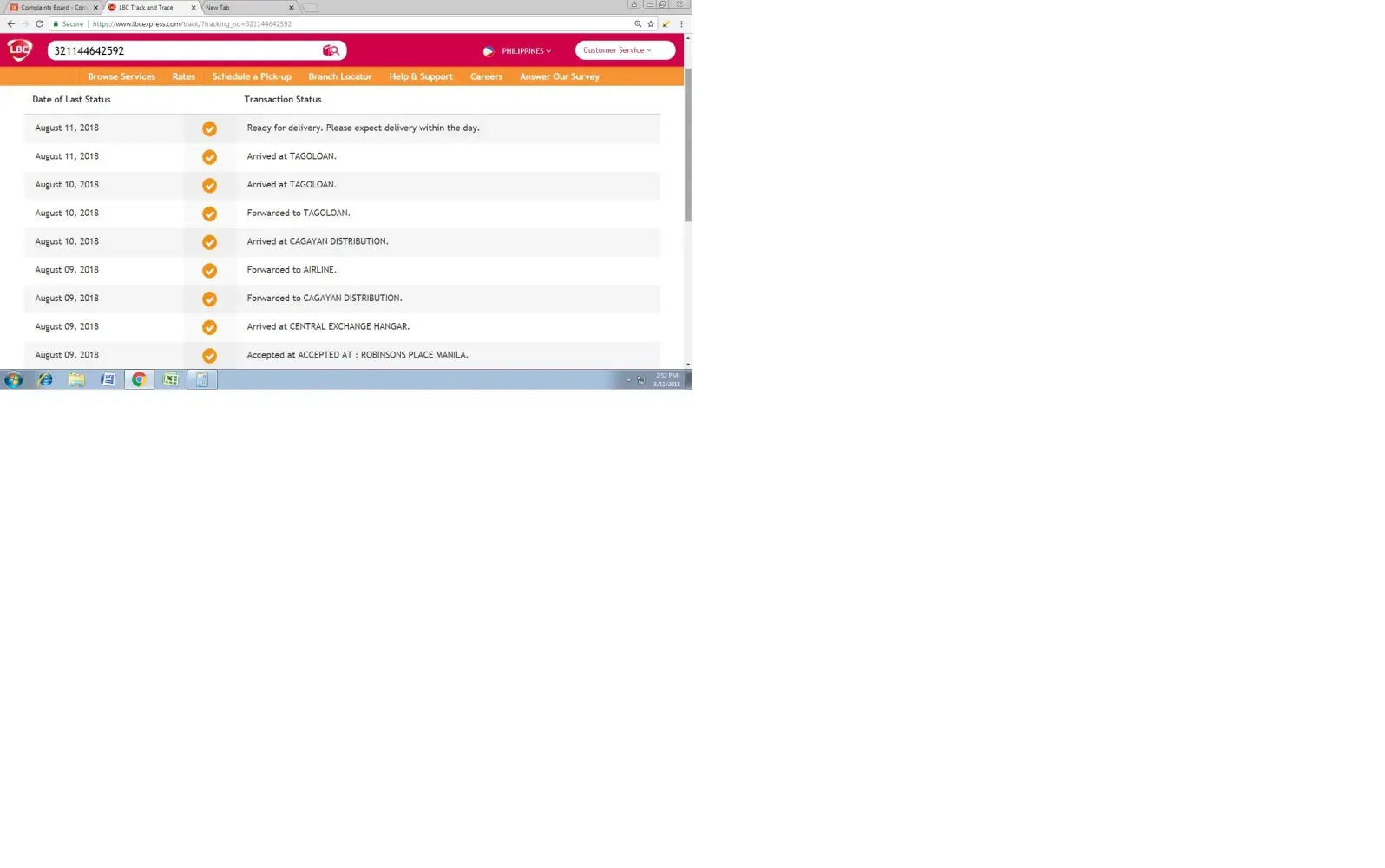 The delivery of the parcels (2 boxes) from New York USA to Mabalacat City Pampanga was incomplete. The tracking number was [protected]. I tracked it on your site and it says that its already in the LBC sea cargo warehouse at Manila since August 8, 2018. 6pm. I received the first box with tracking number [protected], the delivery staff just said that it was forgotten. How was that possible? We need to claim that parcel as soon as possible. We already acknowledged the fact that the weather lately was bad that may cause delays with delivery. But the reason of the delay of the parcel that we should have had received few days ago was negligence of the staff handling the sorting and delivery. I look highly and patronizing your company until this happened.