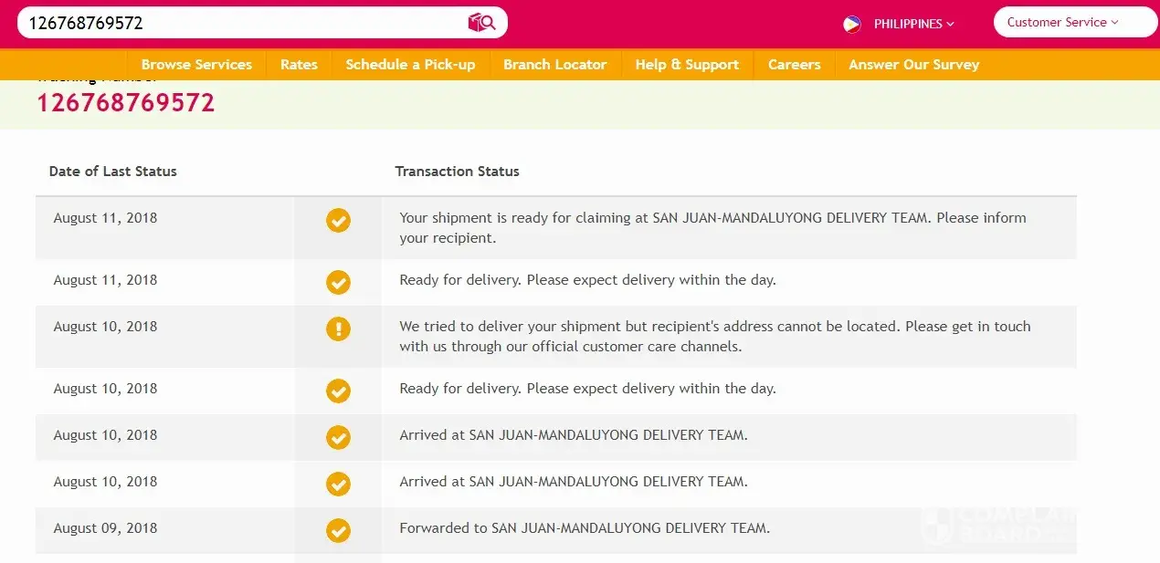 The item inside the package was a mobile phone Samsung that she purchased online worth Php4, 000.00 and supposed to be delivered on her address in Cavite. She is wondering what took the package so long to be delivered on her address that is why she tried to call the branch and the branch stated that they tried to deliver the package however, they can't locate the address and claimed that they can no longer find the package and they claimed it that they already lost the package. I already file a complaint on June, 2018, ticket number: [protected]. Now it's already August, 2018 and yet, no resolution. It's almost 3 months now.