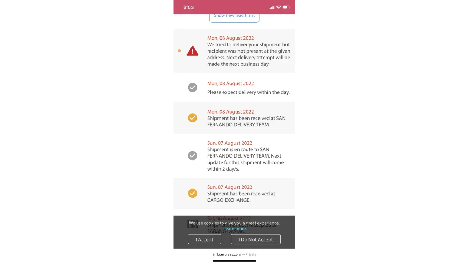 Hello. I would just like to follow up my parcel.. lbc track says it has been on san fernando delivery team since may 20.. may 26 and no update.. "expect delivery within the day".. I need the item..