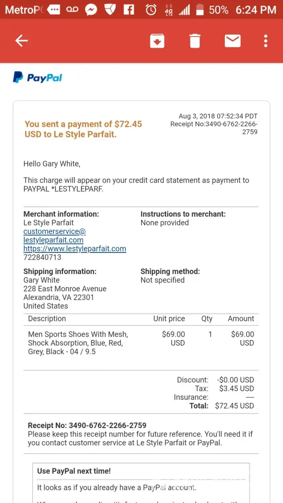 I sent $69.00 + $3.45 tax $72.45 through PayPal to purchase some shoes on August 3, 2018!After a couple of weeks, I emailed the company letting them know that I haven't received my shoes, and Francisca emailed me back and said that they will be here in a week. Now it is September 21, 2018, still no shoes, and the company will not respond back to me, what should I do?